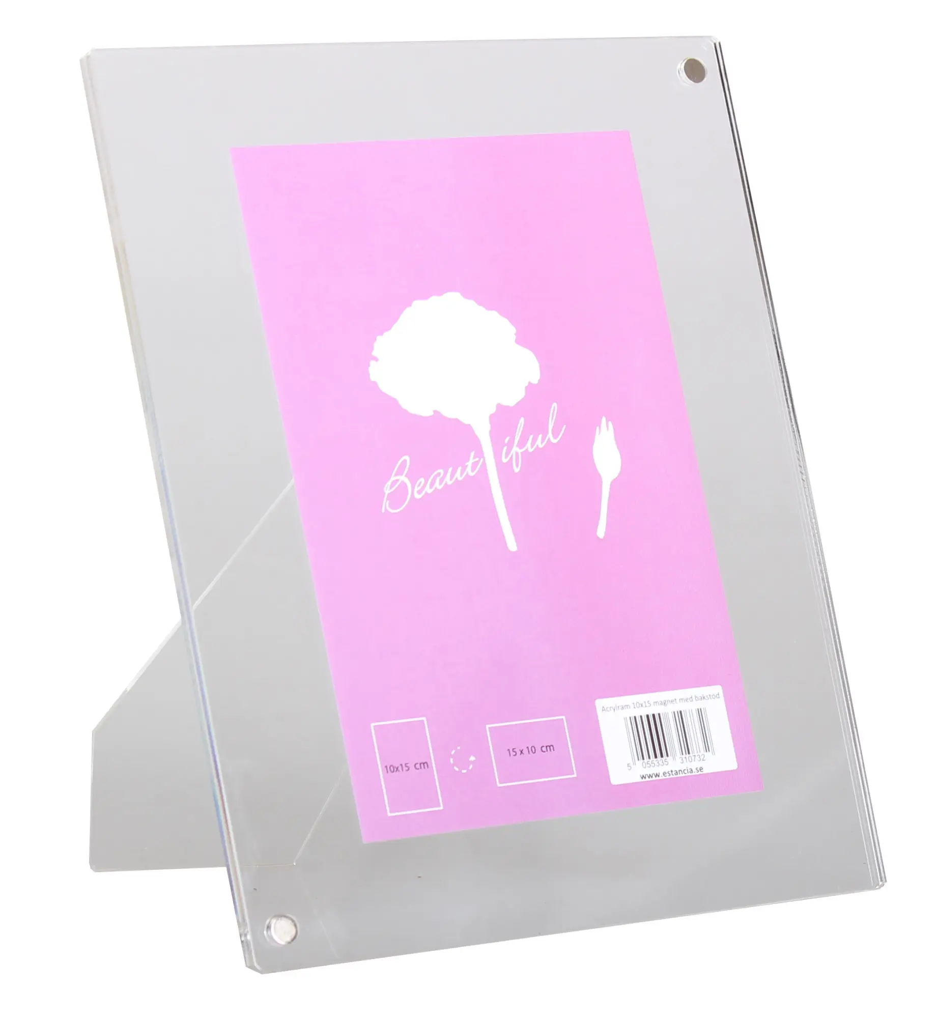 Acrylic picture frame consisting of 2 thick plates of acrylic held together by magnets. The picture frame has outer dimensions of 15x20 cm, making it possible to use for all sizes that are 15x20 cm or less. The size of the insert in the picture is 10x15 cm.