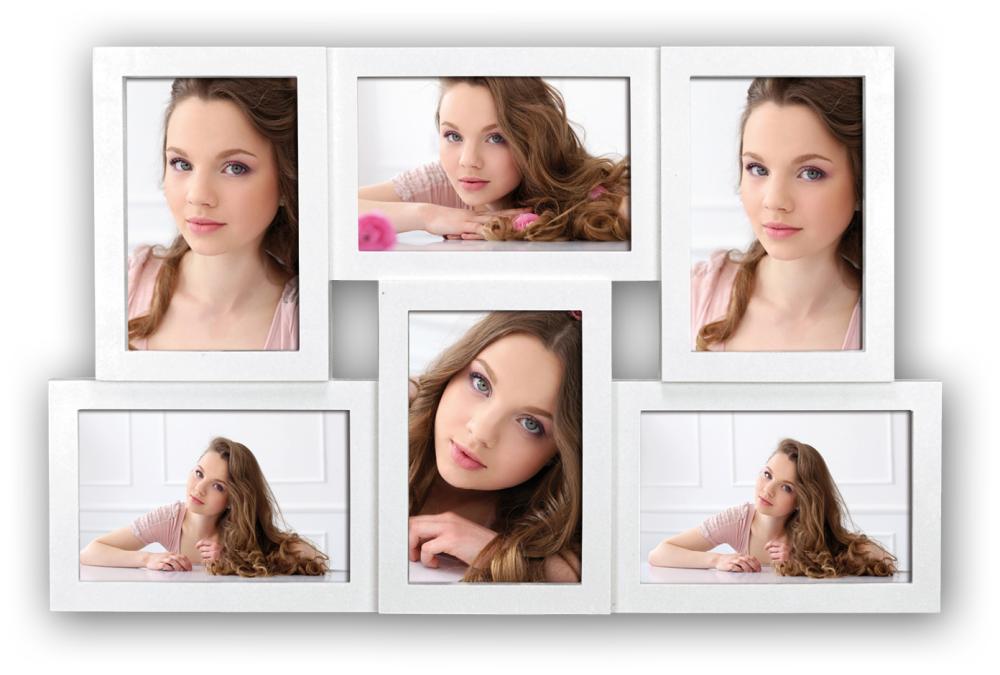 Modern white collage picture frame with space for 6 pictures in both landscape and horizontal format. Perfect for when you want to create a personal photo collage to hang on the wall.
