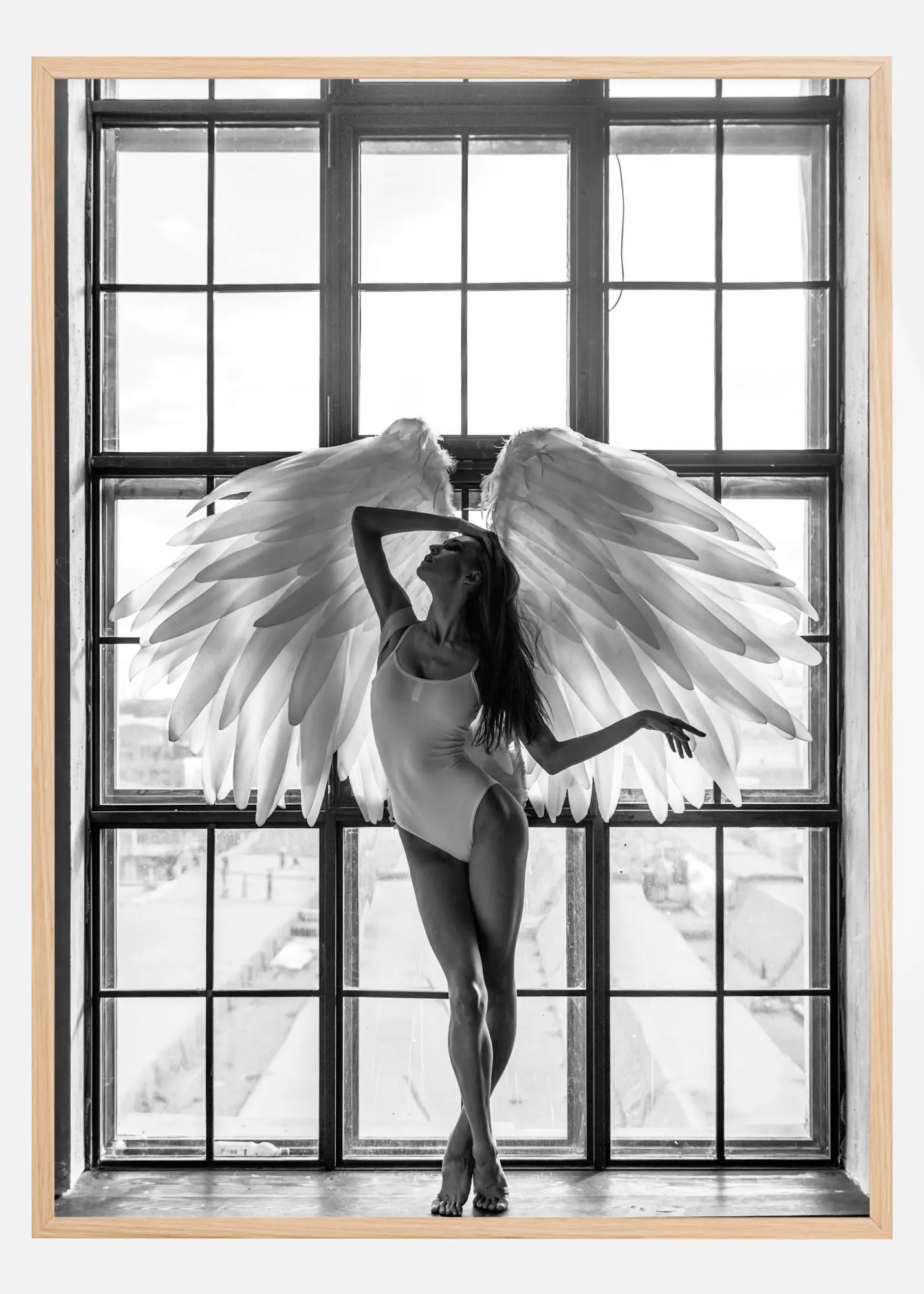 A beautiful photo art poster in dark grayscale of a woman posing in a large window dressed in a bodysuit and large beautiful angel wings. A poster that is easy to combine with other favourites, but also works just as well as a solo focal point.