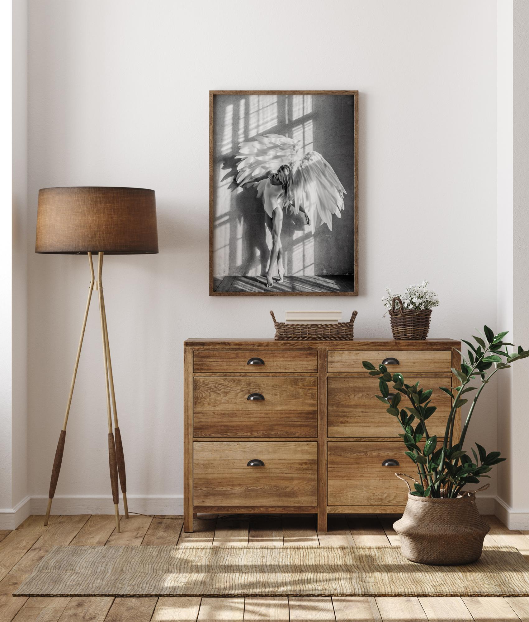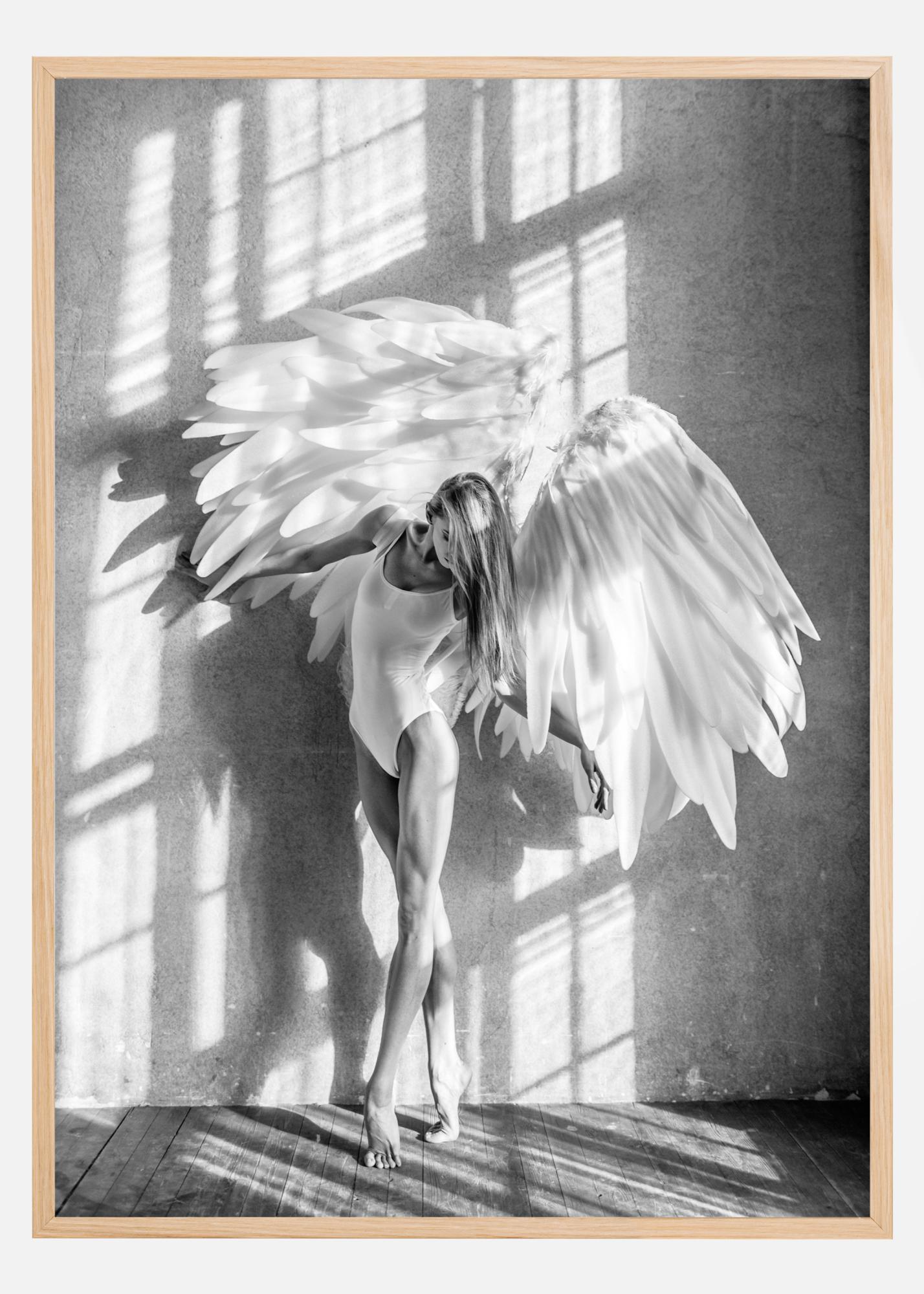 A lovely photo art poster in soft grayscale of a woman posing like a ballerina with a pair of large angel wings in the light from a gigantic window whose shadows play across the image. This is a poster for those who wish for a soft and beautiful addition to their home.
