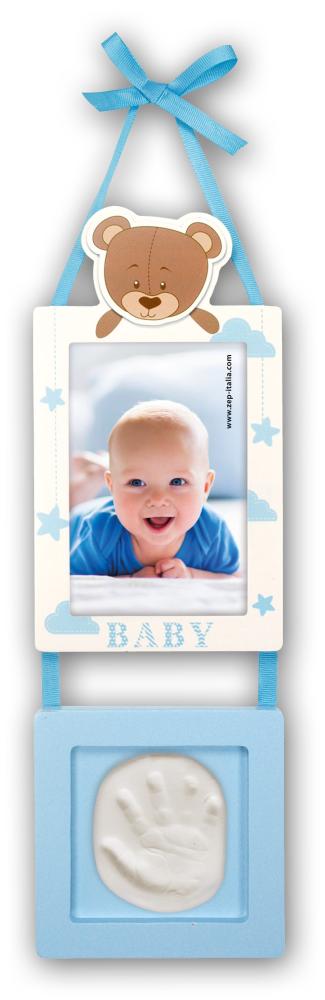 Have you every seen such a sweet baby picture frame? This cute design consists of a blue and white frame where you can put a portrait of a baby, and a smaller blue frame where you can put a hand- or footprint. The two frames hang together on a satin band tied at the top with a bow - this can be used to hang the frames. On top of the white frame is a decorative teddy bear's head, facing the viewer. Comes with a plaster kit for creating a hand- or footprint.