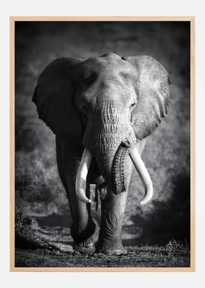 This powerful and captivating poster depicts an elephant in black and white, highlighting the magnificent creature's wrinkled skin and large tusks. The dignified presence of the elephant is captured in detail, and its calm gaze offers a sense of wisdom and timelessness. This image is perfect for anyone who appreciates wild animals and the powerful beauty of nature and wants to add an expressive and thought-provoking element to their home or office.