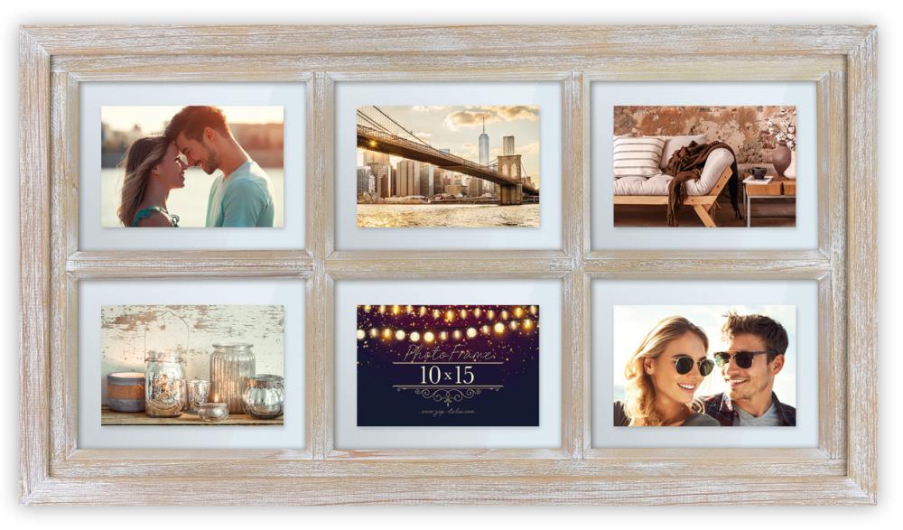 Landscape collage picture frame made from light wood. This is a picture frame with space for 6 photos measuring 10x15 cm. This frame lets you easily arrange a group of pictures together in a nice, aesthetic way. This picture frame has wooden lines which give it a rustic, and somewhat rural, look. This frame's outer measurements are 38.5x69.5 cm. Comes with wall fixings.