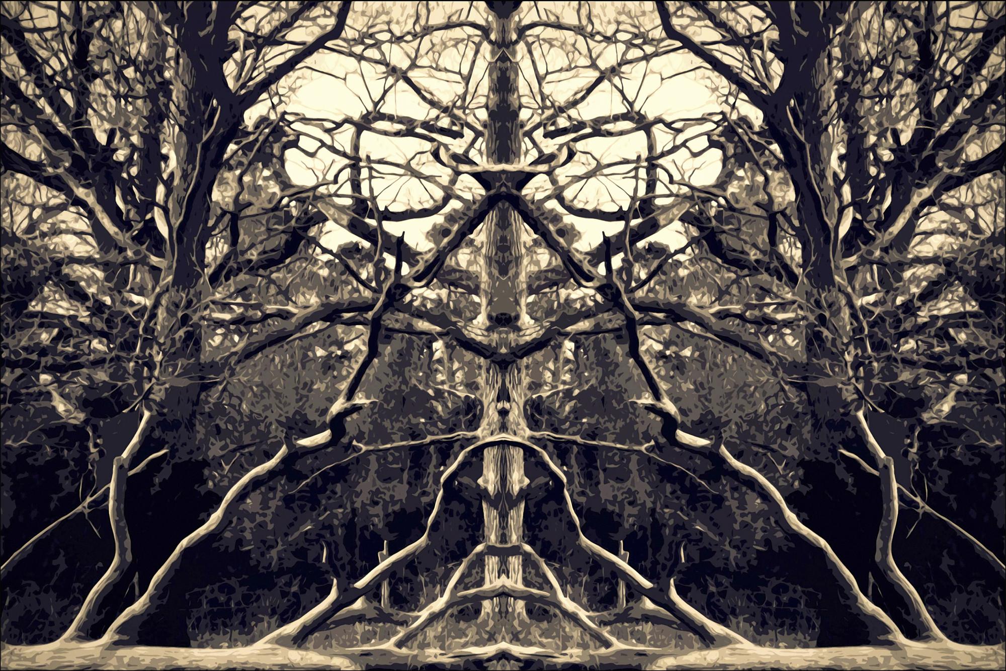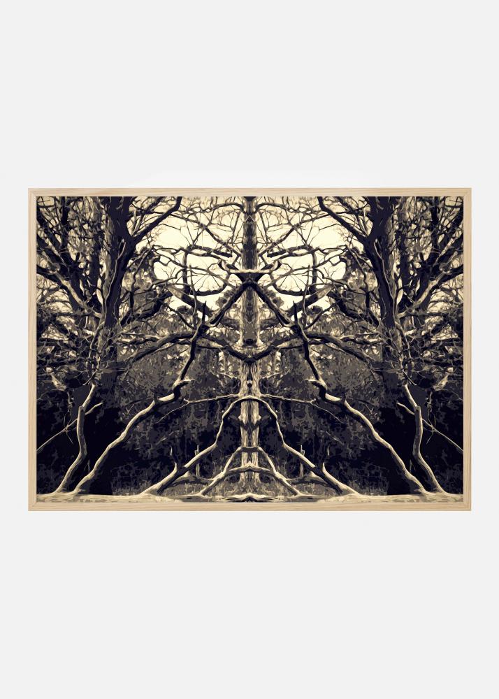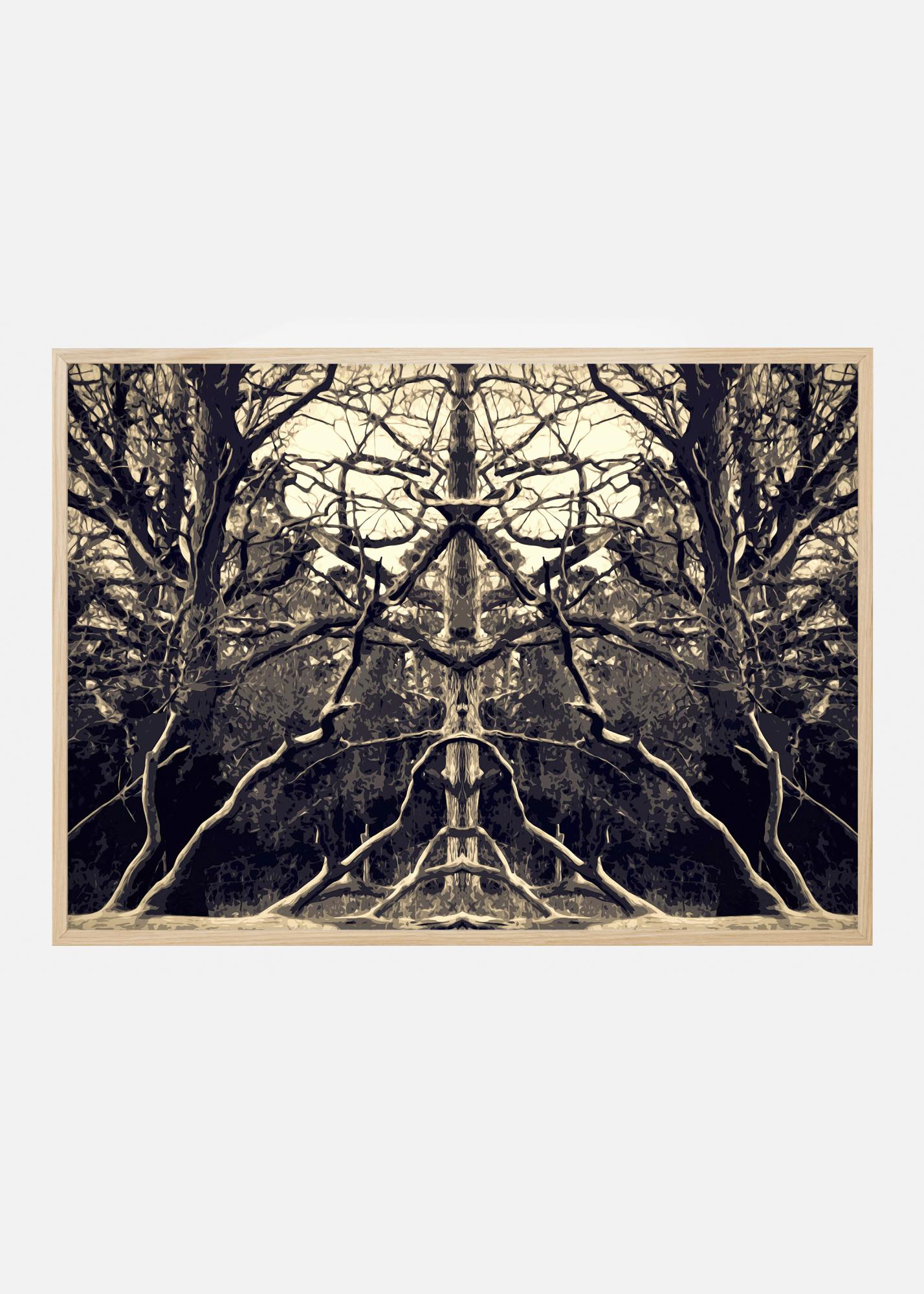 A stunning kaleidoscopic poster of trees and their branches. The mirror image nature of this shot provides a fascinating poster where you can see all sorts of faces and shapes. The light sepia tones of this poster pair well with pastel colours for a softer vibe to contrast with the complexity of the image.