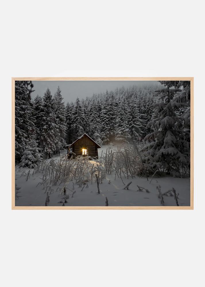 Poster featuring a cute little log cabin in winter attire, deep inside the spruce forest. The light from the window illuminating the frosty winter night gives the photograph depth and makes the picture interesting. The image fits into all interior styles and environments. It looks equally good in a thin black metal frame as in a sturdier wooden version, or why not pick up the light in the picture in a classic gold frame.