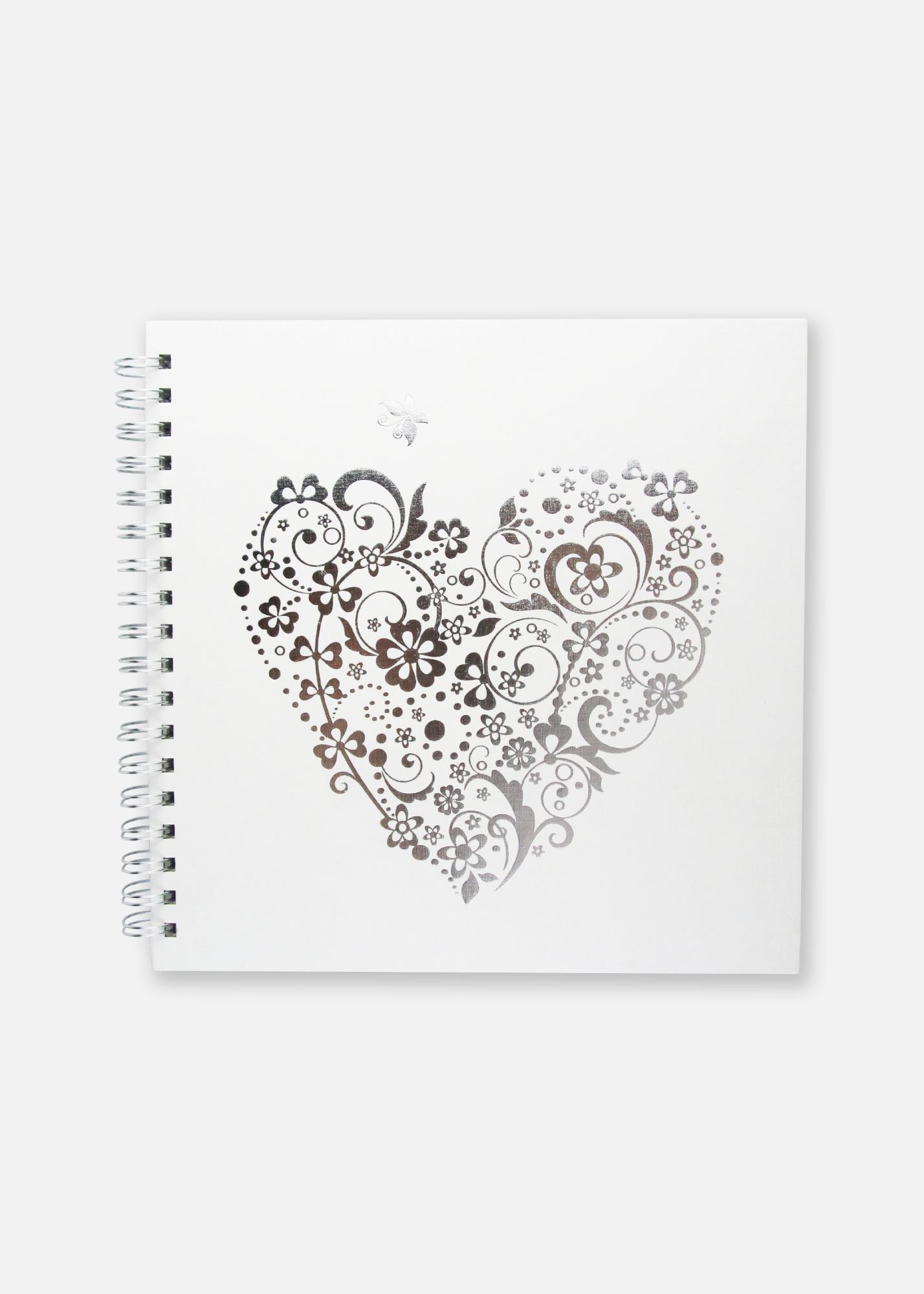 Cute, spiral-bound photo album in white, with size 18x18 cm. On the front is a silver heart printed with beautiful flowery details. This album contains 24 white acid-free sheets, and is a perfect album to have on display for browsing in your home, without taking up too much space.