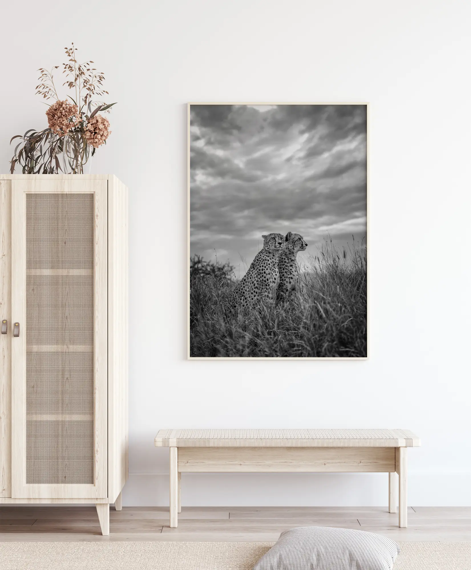 A nature poster of two cheetahs as they stare over the African plains. The overcast sky contrasts with the stunning spots of these animals. Bring the magnificence of nature home with this poster.