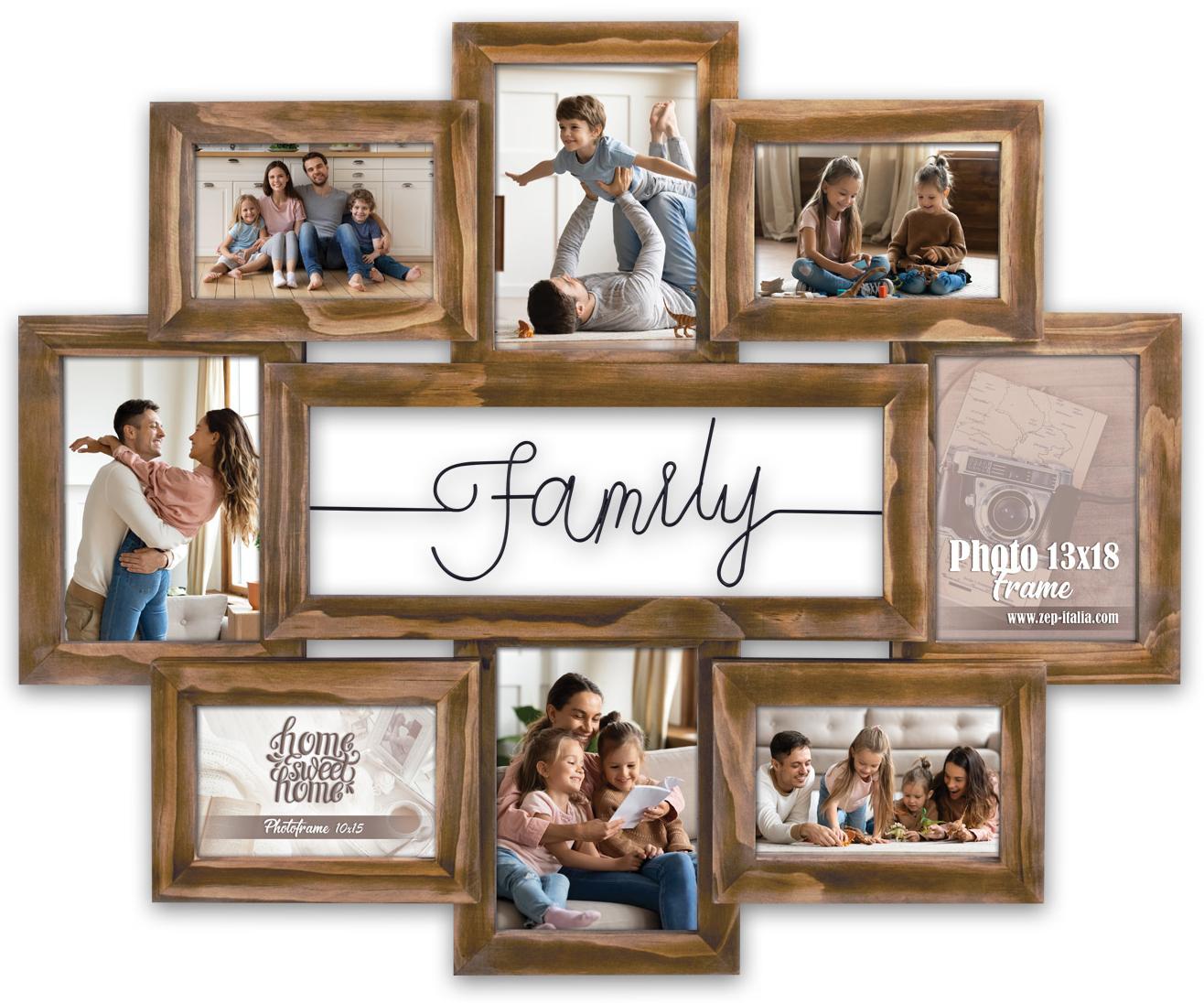 This beautiful collage picture frame is perfect for developing and framing in your favourite photos of your family! The frame has a warm, brown wooden colour, with the word "family" in black lettering in the middle. This pictures frame accommodates 8 pictures measuring 10x15 cm and 13x18 cm. Comes with wall fixings.