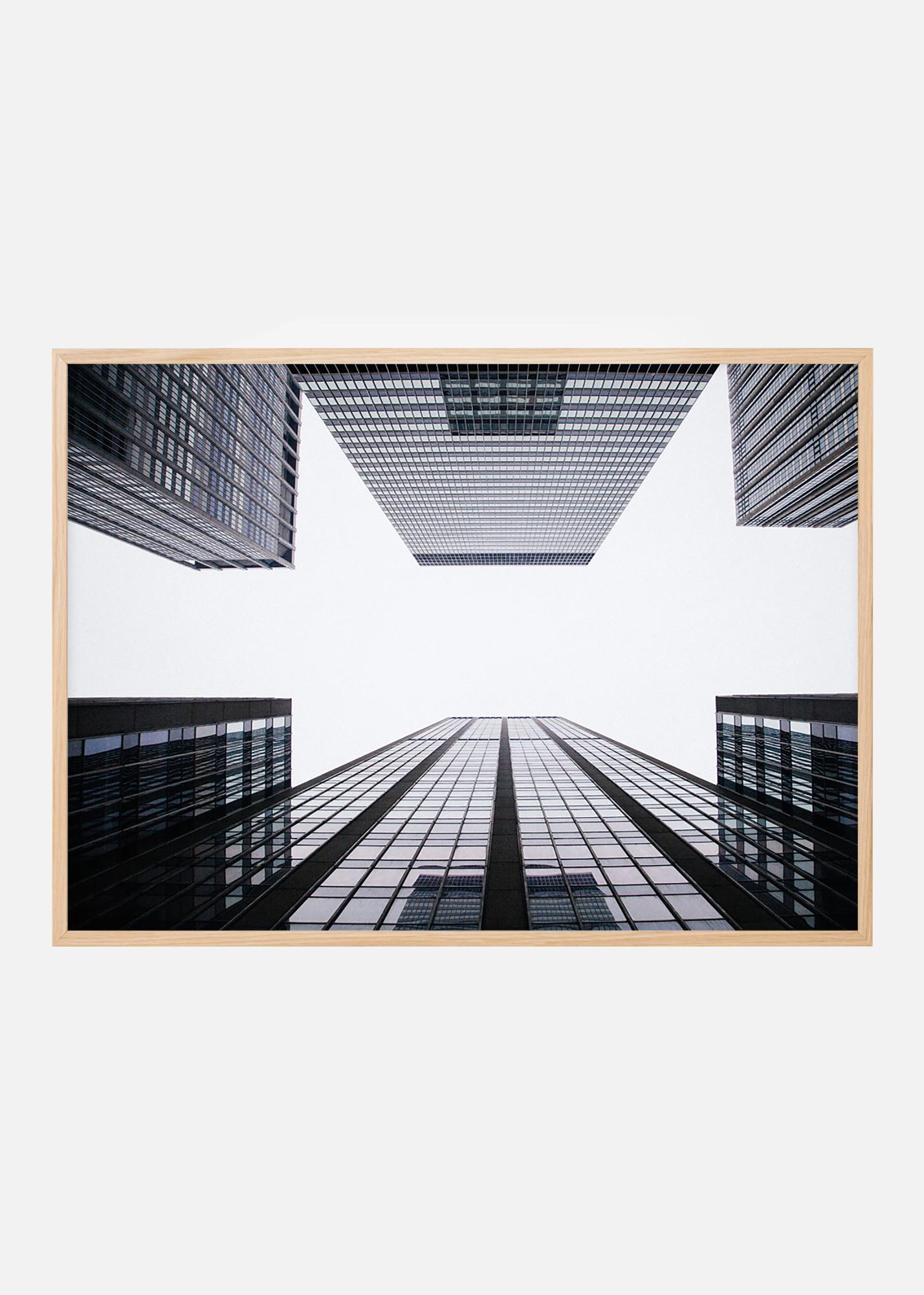 Architecture posters featuring growing skyscrapers against a cloud-white sky. Sleek image of dark buildings against a white background, with reflections of the sky in the glass panes. The perfect gift for someone who likes graphic building portraits. The print looks great in a black frame that enhances the darkness of the image and looks nice in combination with other photographs of architecture.