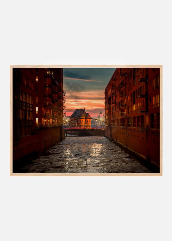 Sunset over the old warehouse district Speicherstadt in Hamburg with its canals and neo-Gothic brick buildings. The photograph from the heritage-protected area fits nicely in the home of someone interested in architecture or history. The poster is best suited in a thin metal frame that matches the strict architecture and looks stylish on the wall together with other city images.