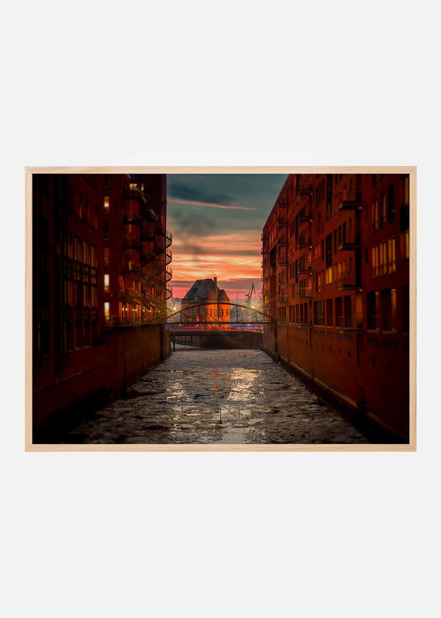 Sunset over the old warehouse district Speicherstadt in Hamburg with its canals and neo-Gothic brick buildings. The photograph from the heritage-protected area fits nicely in the home of someone interested in architecture or history. The poster is best suited in a thin metal frame that matches the strict architecture and looks stylish on the wall together with other city images.