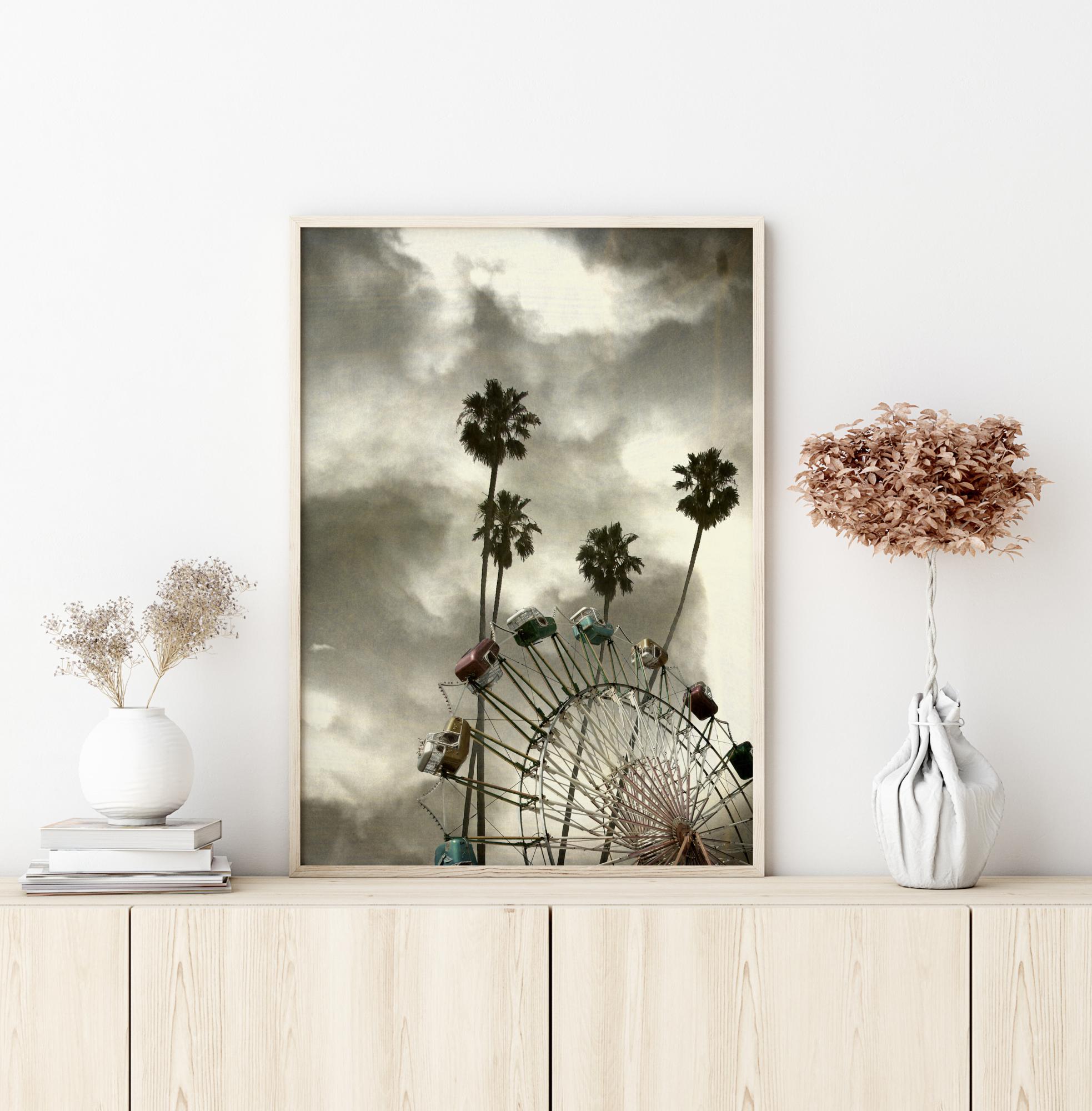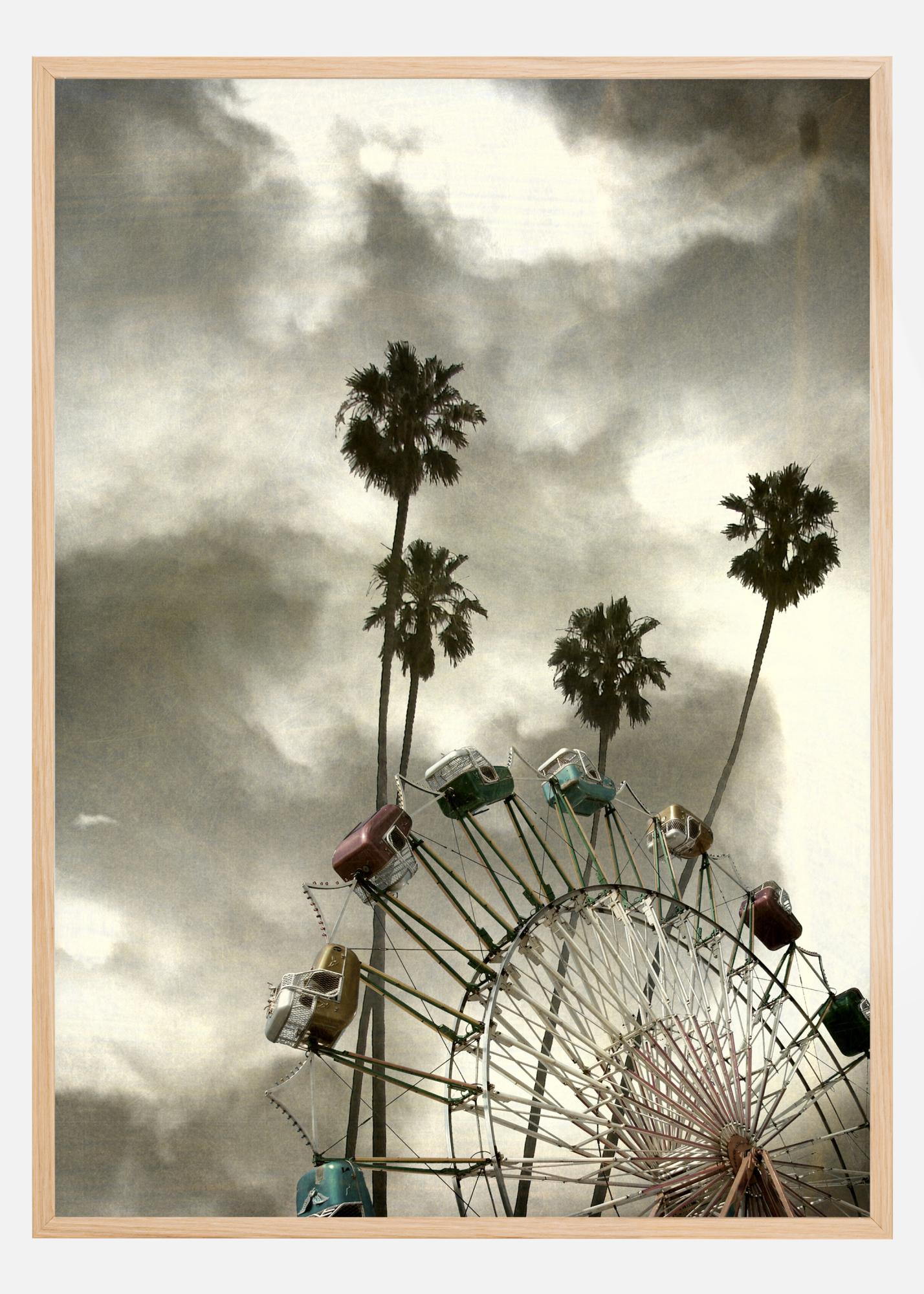 A photographic poster of a Ferris wheel-like carousel with carriages in lovely pastels against a backdrop of palms and a dramatic sky. A beautiful poster with a lot of feeling.