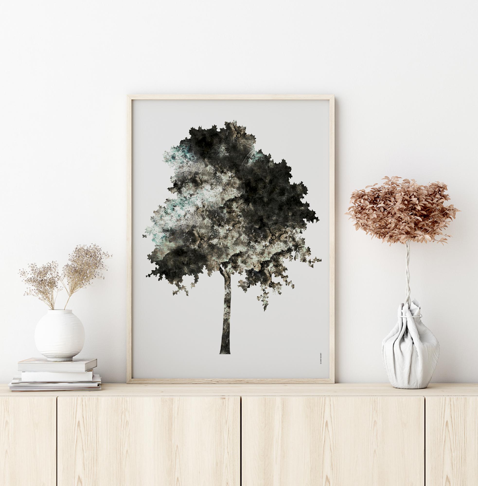 A graphic art poster in the form of a tree, created by the graphic artist Isabell Larsson, VISSLA Visual Design. A wonderfully minimalist painting in harmonious colours that fits just as well in the hallway or kitchen as in the living room, bedroom, or library.