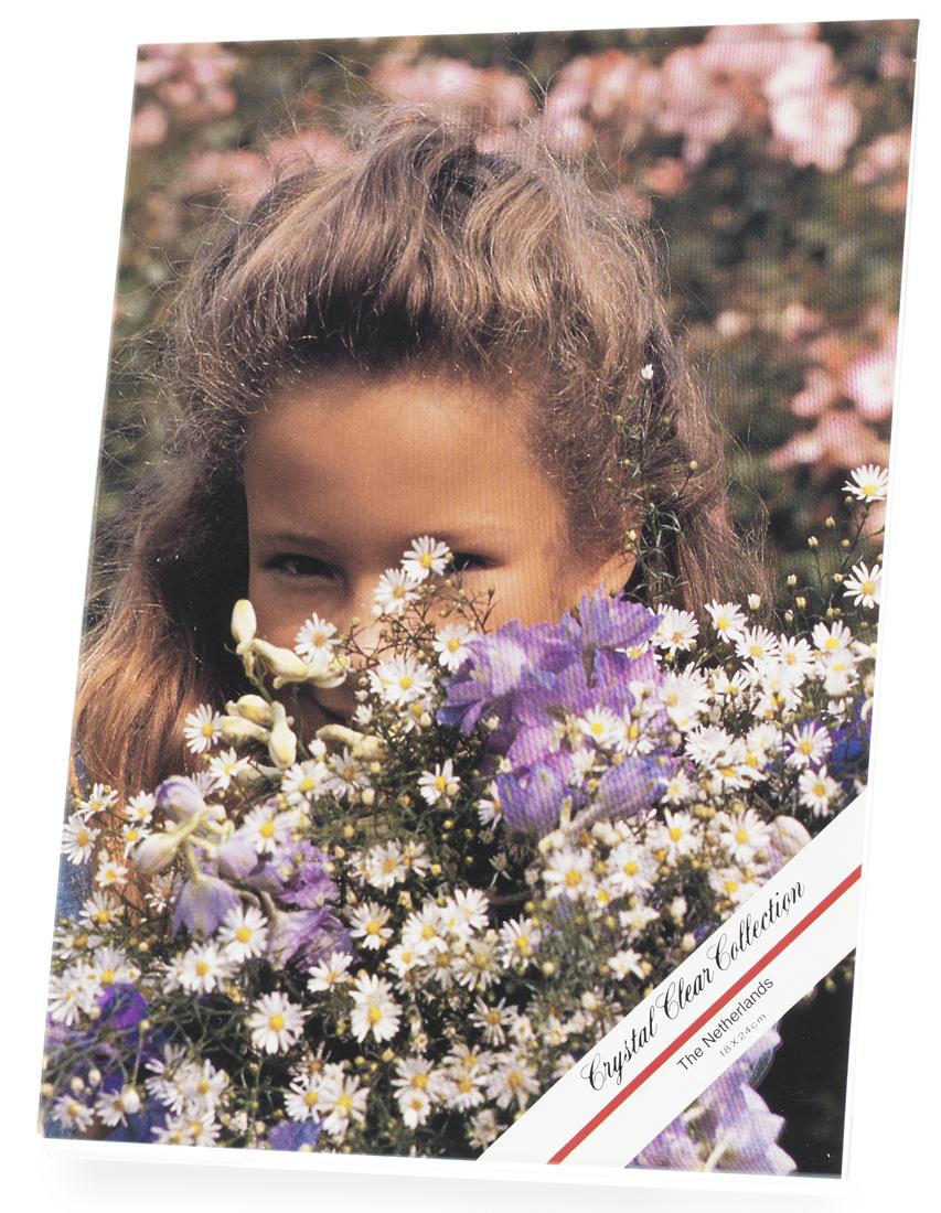 Transparent, backwards leaning plastic photo holder. Best placed, for example, on a table.