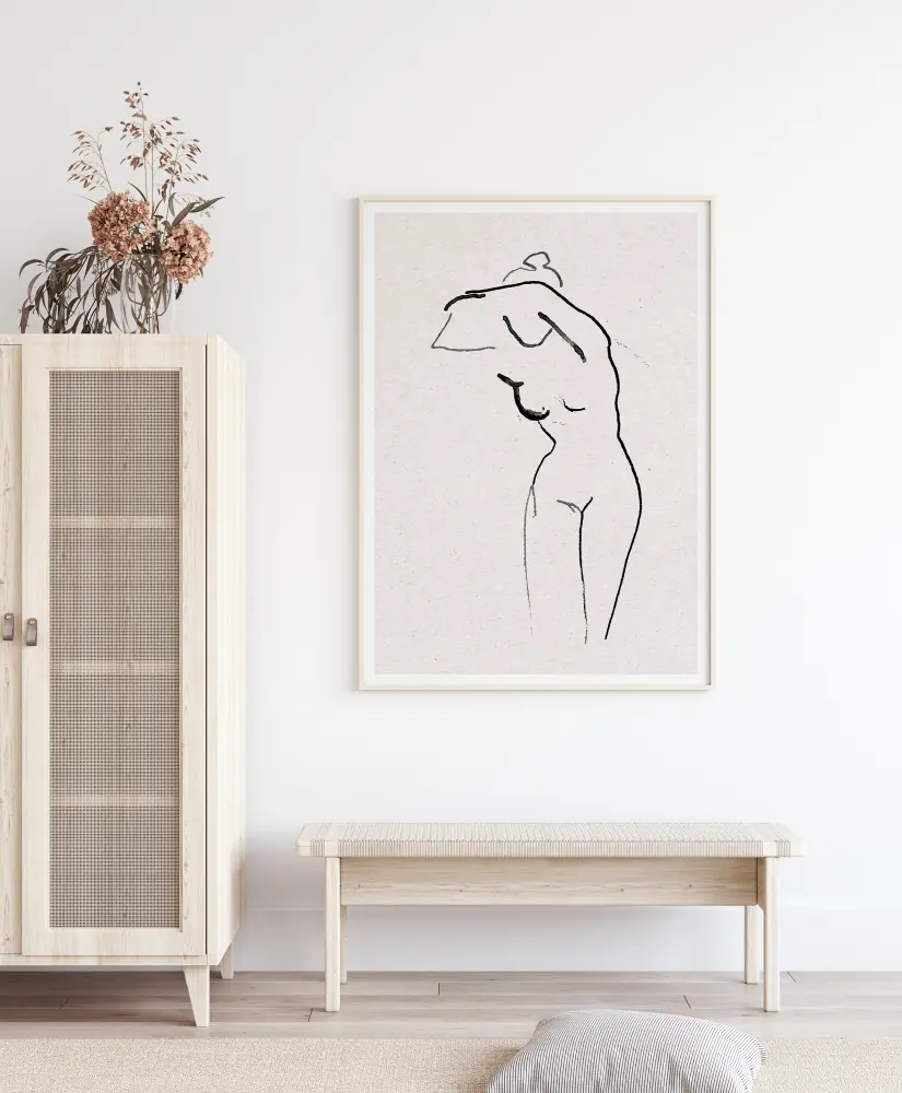 A graphic art poster in watercolour created by Cora Art and Illustration. Here, a woman takes shape in thin black lines against a light grey background. The delicate motif is then surrounded by a slightly narrower white mount.