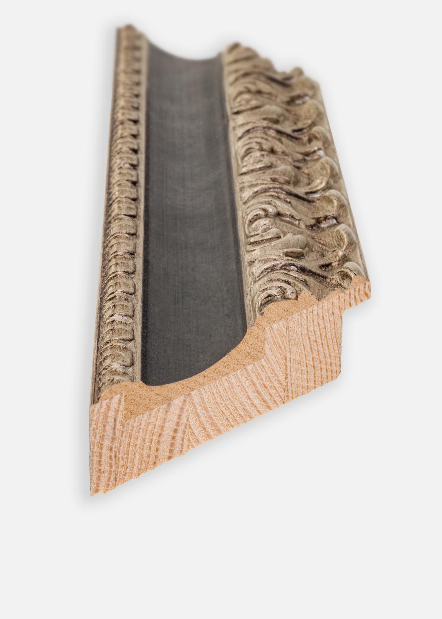 "Drottningholm Silver" is a beautiful Italian retro picture frame with hand-painted, hand-spliced pine. The picture frame has a richly decorated silver edge with a wide black strip around the outside, giving this picture frame its elegant feeling. Perfect for framing anything in a retro style.