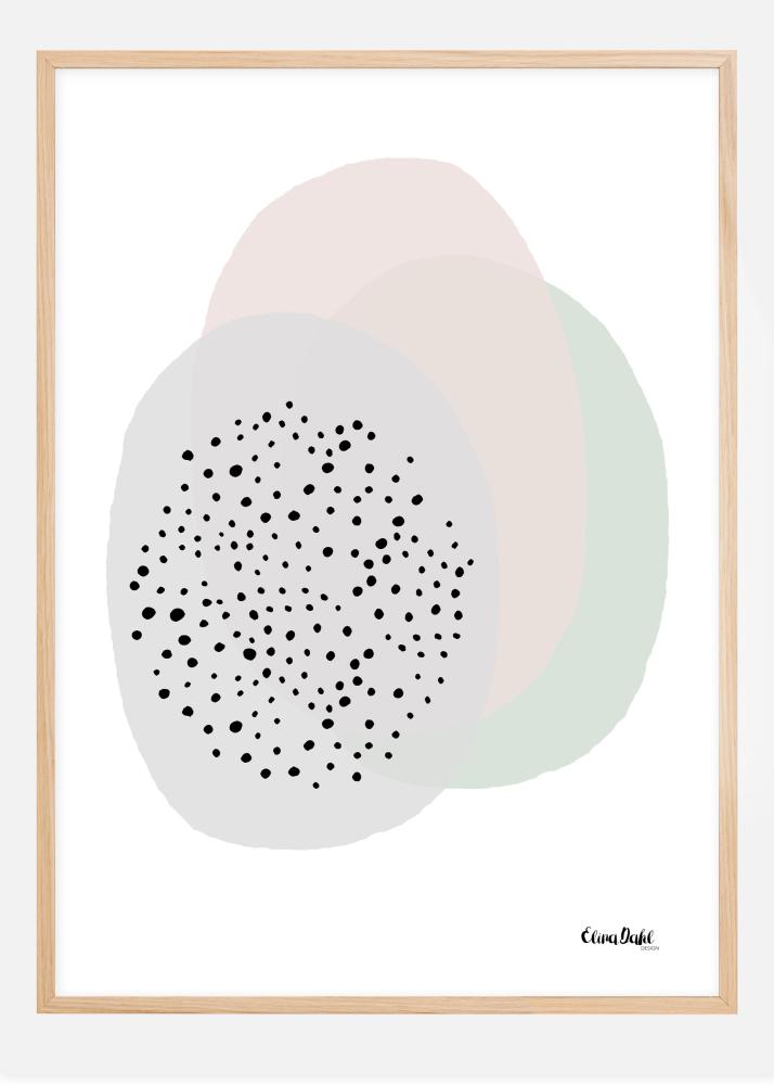 An artistic poster featuring a strange shaped blob of three different colours, one of which contains a series of small black dots. The blue, pink and green of the overlapping shapes add a soft touch to this abstract image. Make them stand out more by picking a matching coloured wall on which to mount this piece.