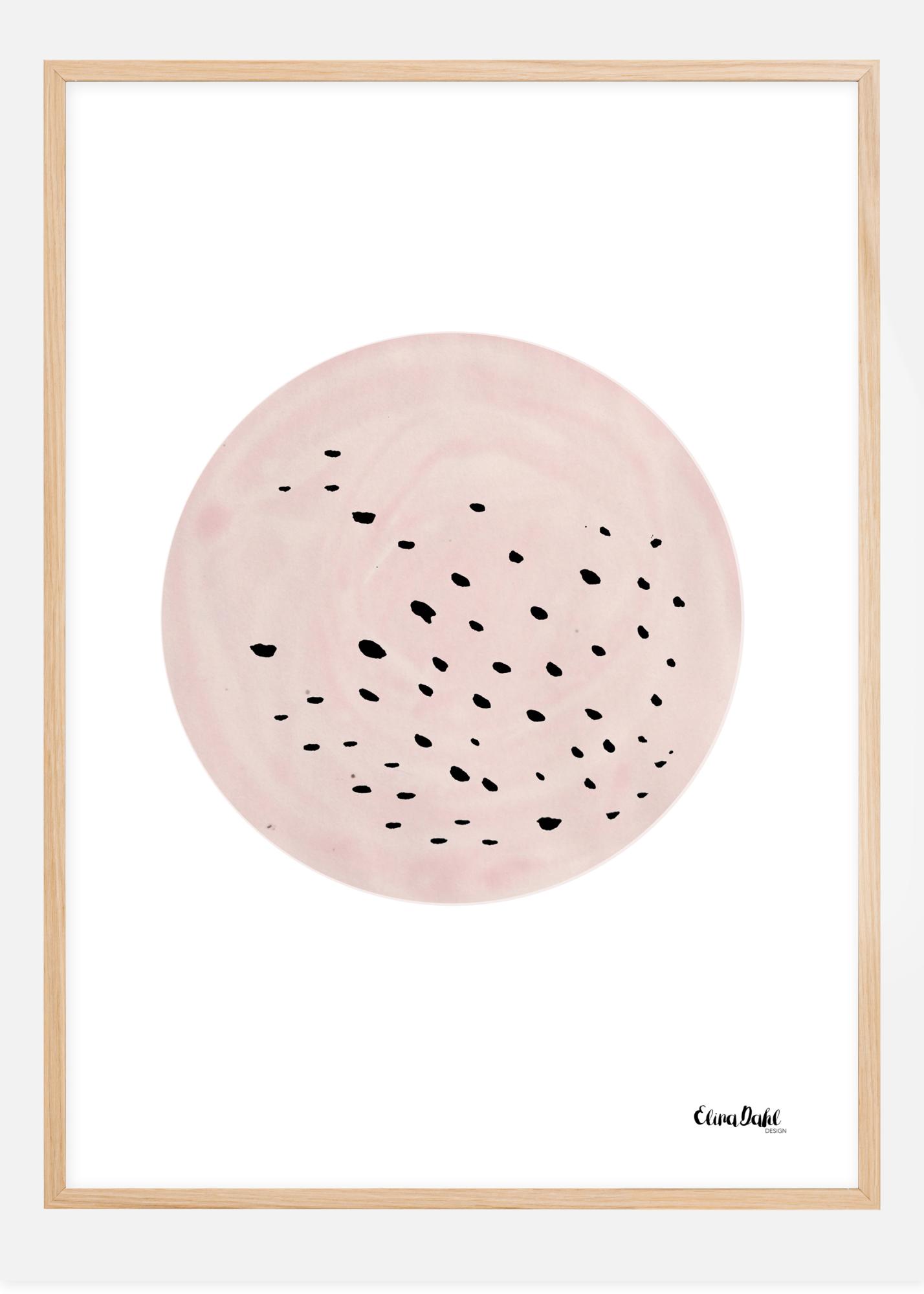 An abstract poster of black dots in a pinkish beige circle. The pinky beige of this circle is filled with small dots speckling the surface. The ball is suspended on a plain white background. Match this strange but compelling image with a strong bold background for a truly interesting art piece.