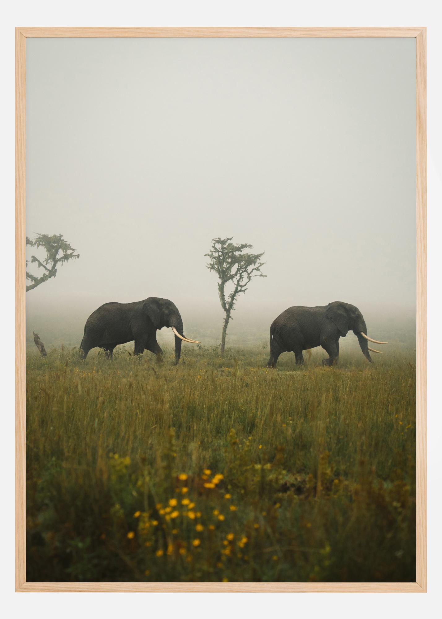 A nature photograph of a pair of elephants wandering in tall grass between barren trees. The dense fog in the background creates sharp contrasts that highlight the large animals extra clearly. A poster for those who love the savannah and its largest inhabitants!