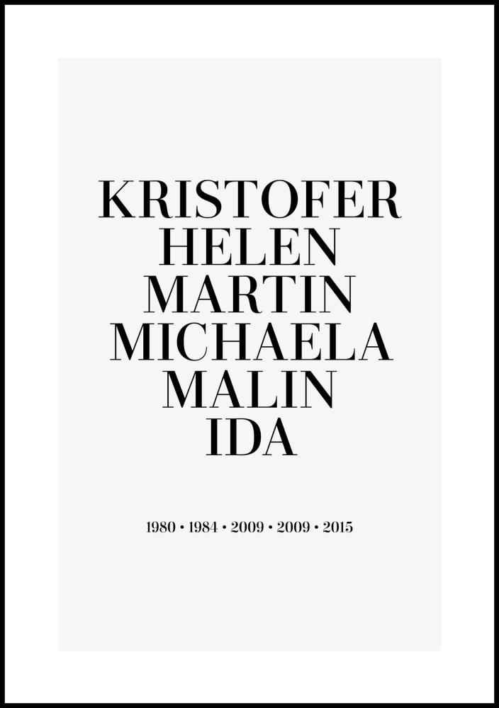 Family picture - 6 Names & Birth years - Grey (21x29,7 cm (A4))