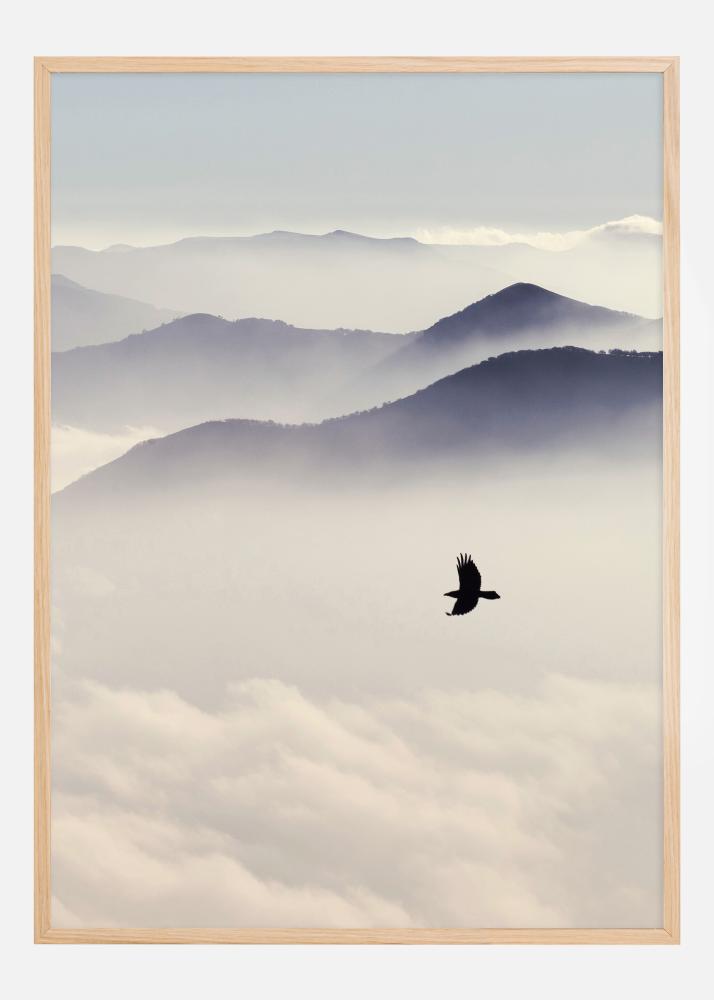 This nature-inspired poster captures a simple yet powerful image of freedom and silence. A solitary bird sails majestically over a misty valley, with layers of mountains gradually disappearing in the soft light of dawn or dusk. The soft tones and the minimalist landscape provide a sense of tranquility and boundless freedom.