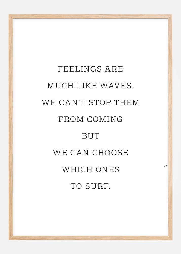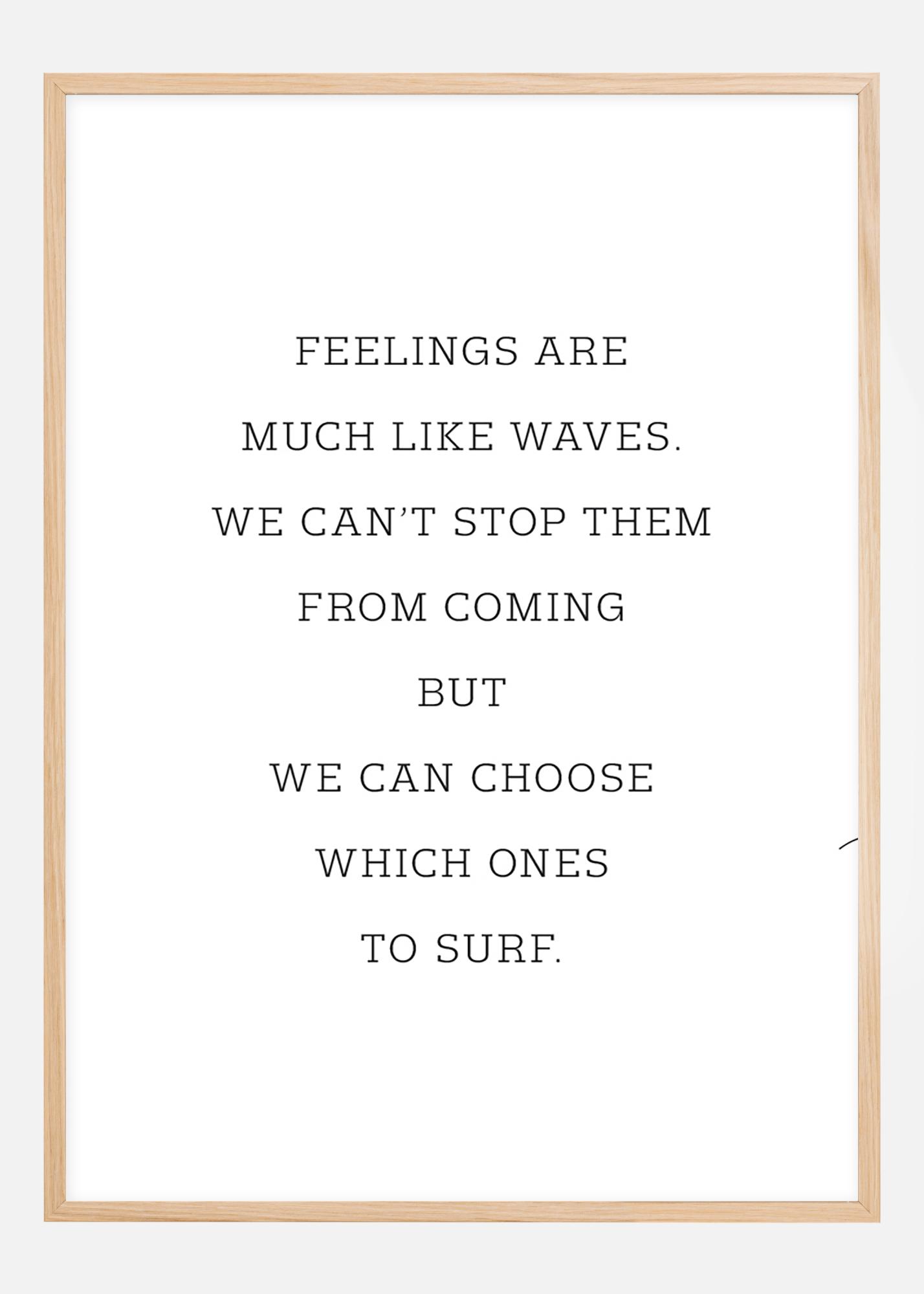 A motivational poster to keep you going every day. Feelings are Much like Waves. We Can't Stop Them From Coming But We Can Choose Which Ones to Surf. Kickstart your day with this strong quote in a simple type set on a plain white background.