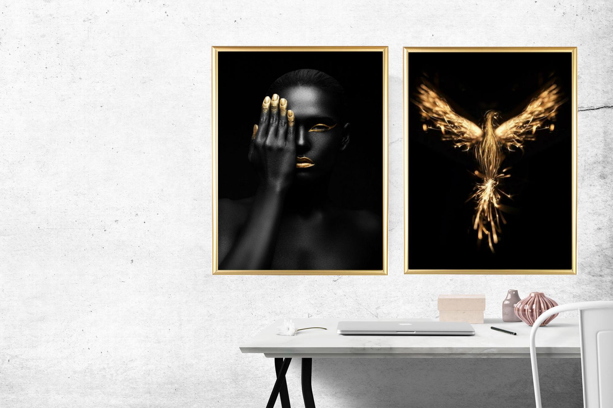 Through graphic art, the Phoenix takes shape in a fireworks display of gold tones against a black background. A warm and comfortable poster in a minimalist format, perfect to match with other favourites in a larger collage.