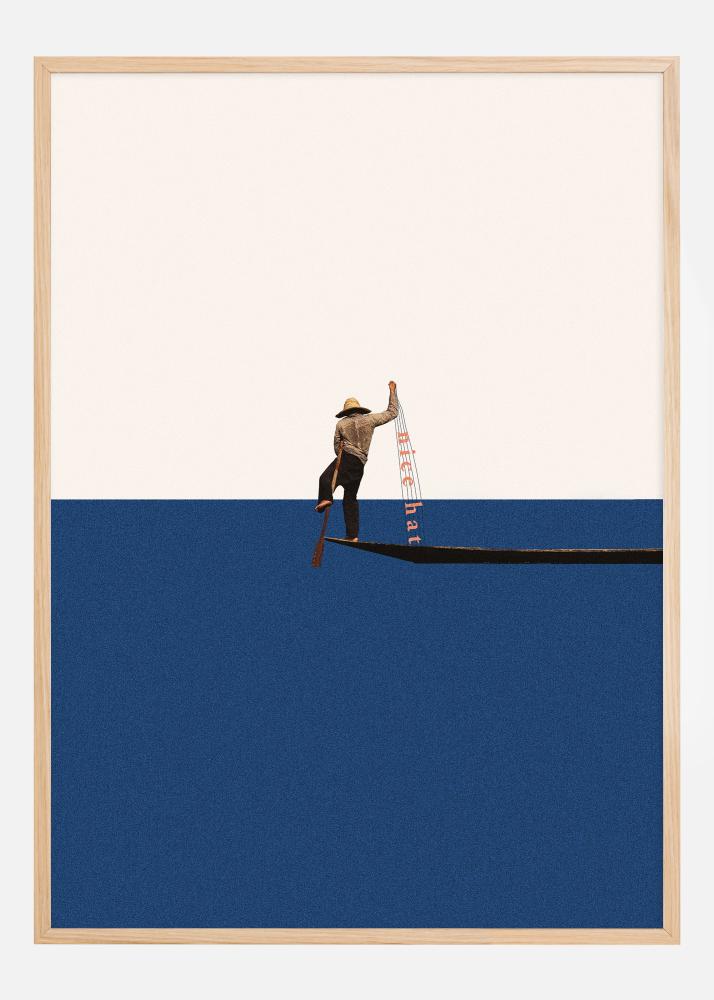 The color palette is limited but expressive, with the dominant blue hue of the water evoking both tranquility and depth. The light beige background provides a neutral canvas that allows the other colors to stand out. The contrasting colors; brown, blue, beige, and accents of red, interplay to create a balanced and appealing aesthetic. It is a print that offers more than just visual enjoyment; it is a conversation starter that suits well in a hallway, living room, or office.