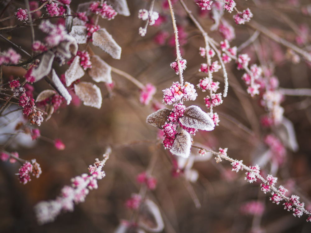 Photo art with a close-up of frost-kissed dewy berries with a short depth of field. The print, with the berries in pink and the background in chocolate tones, gives a warm and cozy feeling. In a larger size with a stylish frame, the painting becomes a focal point in the living room or put a smaller version in the picture collage along with other posters in the same colour shades.