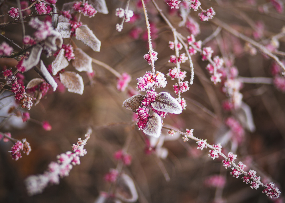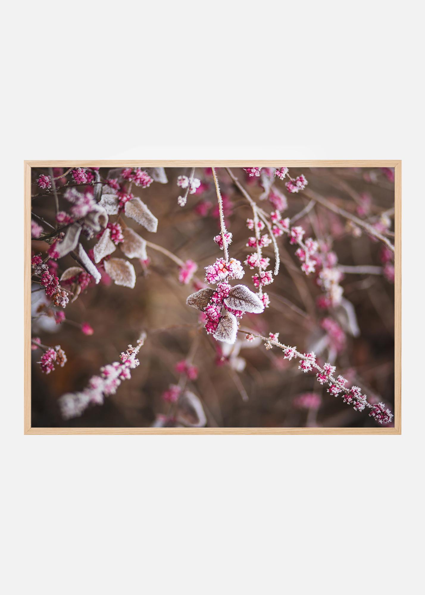 Photo art with a close-up of frost-bitten, dewy berries with a short depth of field. The print, with the berries in pink and the background in chocolate tones, gives a warm and cozy feeling. In a larger size with a stylish frame, the painting becomes a focal point in the living room, or place a smaller version in the picture collage along with other posters in the same colour shades.
