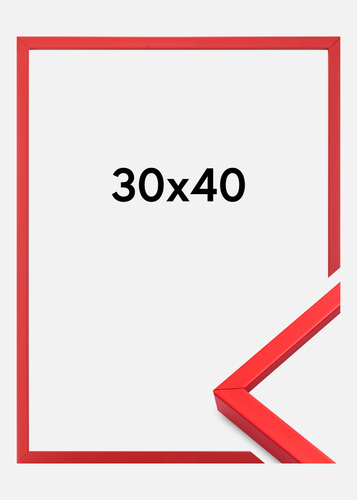 This is an elegant red picture frame made in Sweden. It is a wooden picture frame with acrylic glass, a type of plastic that is like glass but isn't as fragile. This beautiful and colourful picture frame will give your picture a stylish lift, and make it a real eye-catcher in your home! Its edge measures 12 mm wide and 20 mm deep. On the back of this picture frame, you'll find wall fixings allowing you to hang it in both portrait and landscape orientations. This lovely red picture frame comes in several sizes, with this one measuring 30x40 cm.