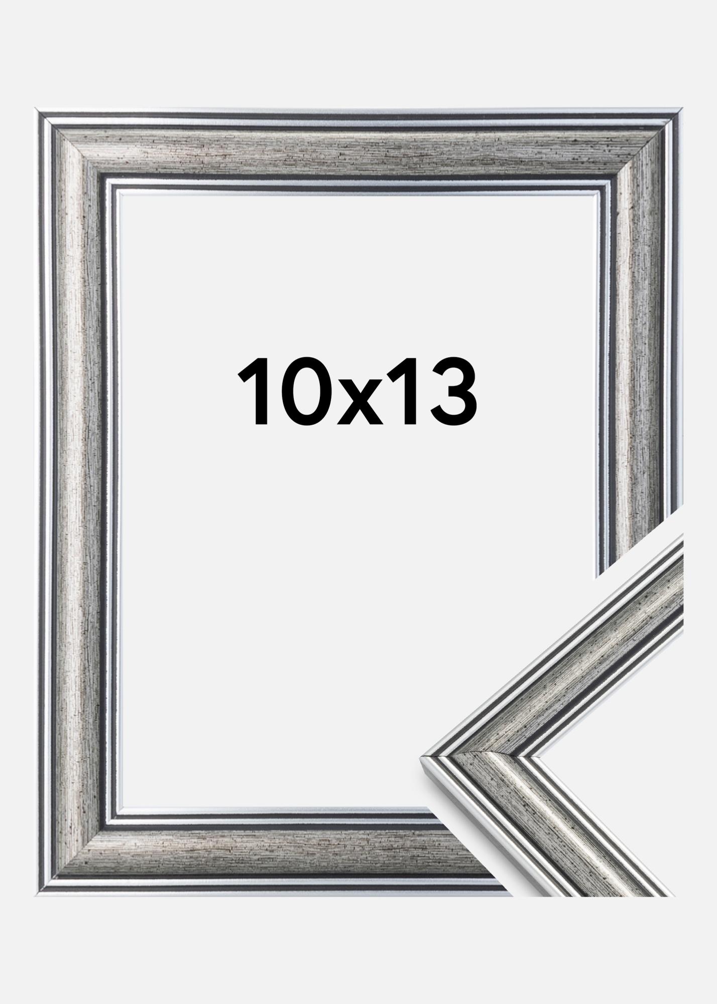 Frigg is a silver picture frame with black lines and black speckled elements. Works great when you're looking for a traditional, wide silver picture frame which goes together with lots of different kinds of picture and setting.