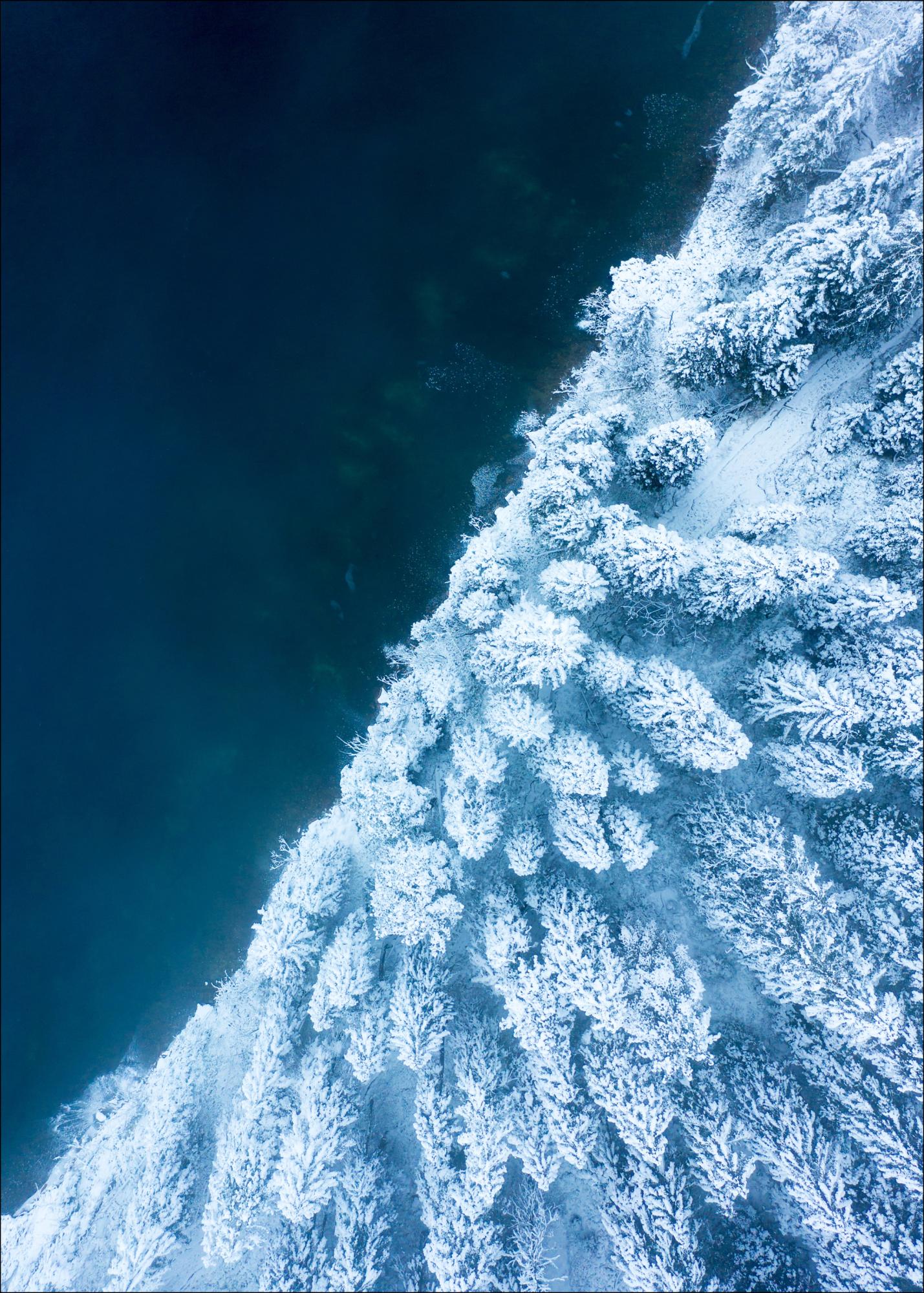 An exciting photographic poster from a bird's-eye view where snow-covered forest meets a blue-frozen sea in a sharp diagonal. A beautiful nature poster in cold tones, perfect to have as part of a larger collage.