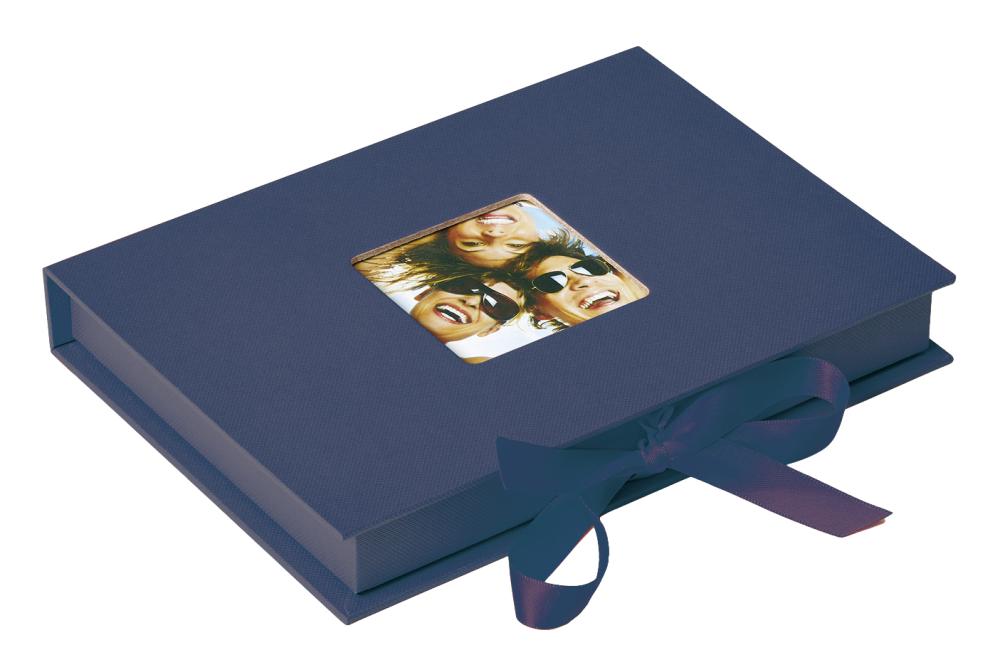 Attractive photo box with a modern design in a beautiful Blue colour. Accommodates 70 pictures with the dimensions 13x18 cm. On the top is a space for your own 6x6 cm picture, so you can easily personalise your photo box.