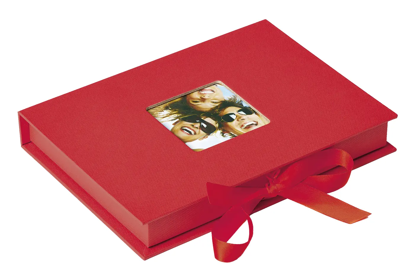 attractive photo box with a modern design in a beautiful red colour. Accommodates 70 pictures with the dimensions 13x18 cm. On the top of the box is a space for your own 6x6 cm picture, so you can easily personalise your photo box.