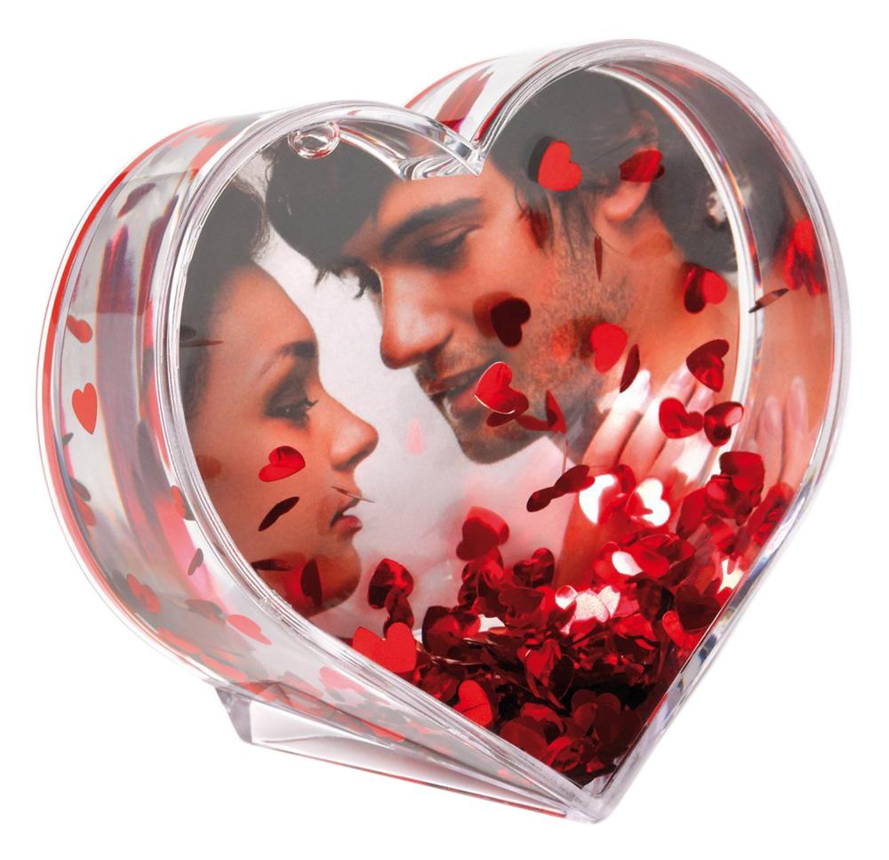 This heart-shaped photo frame gives your photos a very romantic framing. The frame is made from durable acrylic plastic filled with red metal hearts which create an effect reminiscent of a “snow globe”. The photo frame has room for 1 picture 9.1x6.5 cm in size.
