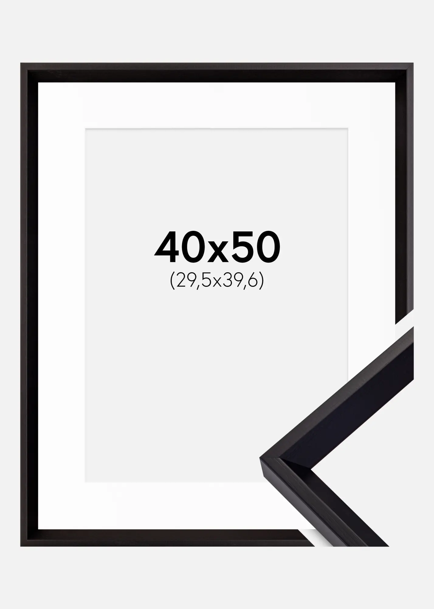 Package including picture frame and matching white mount. The product image shows the dimensions of the frame (indicated in bold) and the inner dimensions of the mount (indicated in brackets). Note that the inner dimensions of the mount should be 1 cm smaller than the image size.