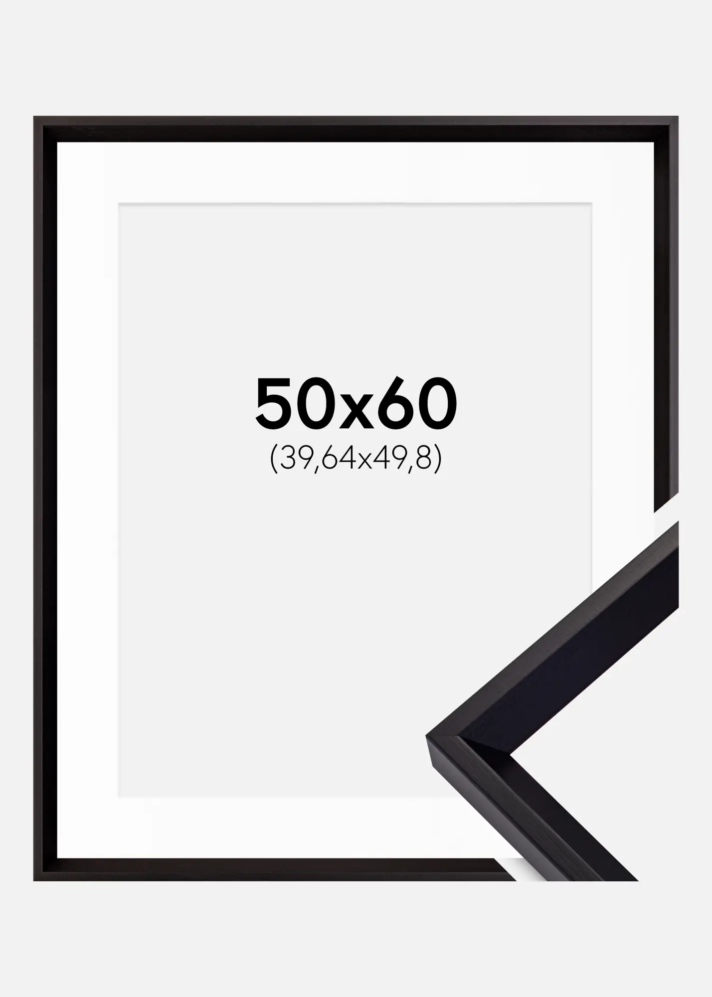 Package including picture frame and matching white mount. The product image shows the dimensions of the frame (indicated in bold) and the inner dimensions of the mount (indicated in brackets). Note that the inner dimensions of the mount should be 1 cm smaller than the image size.