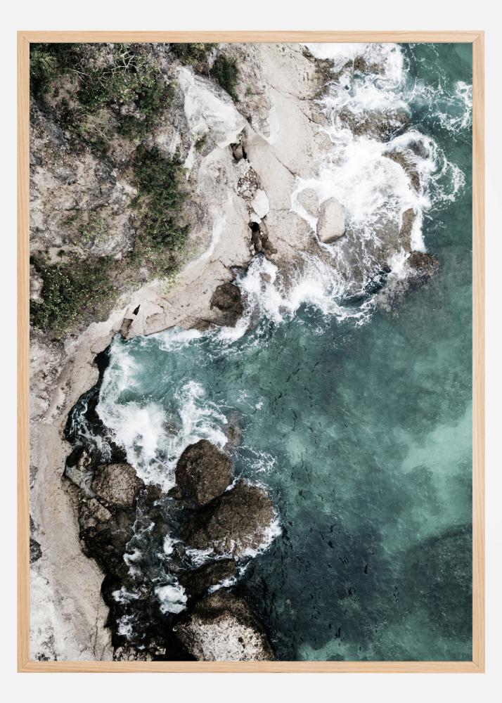 An aerial poster of the sea with the waves crashing against the rocks. Enjoy the beauty of this picture as you admire the crystal blue sea swashing against the algae covered rocks. The beauty of this picture almost allows you to smell the freshness in the air.