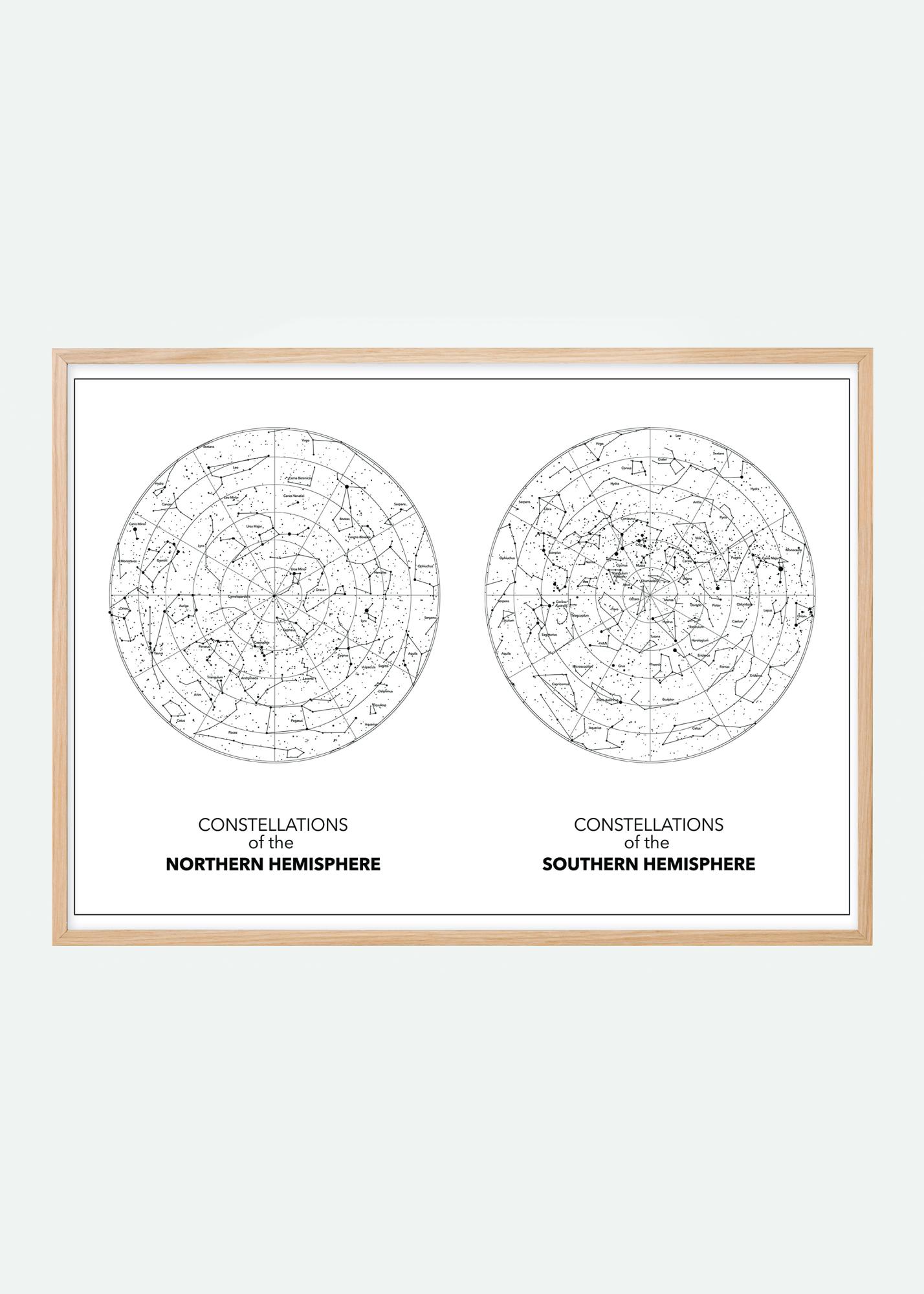 A black and white print of the Northern and Southern hemispheres. Set on a white background, the constellations are faintly outlined in black. Placed side by side you can admire the mystery of the stars. Hang this print in your study and create a sense of infinity.