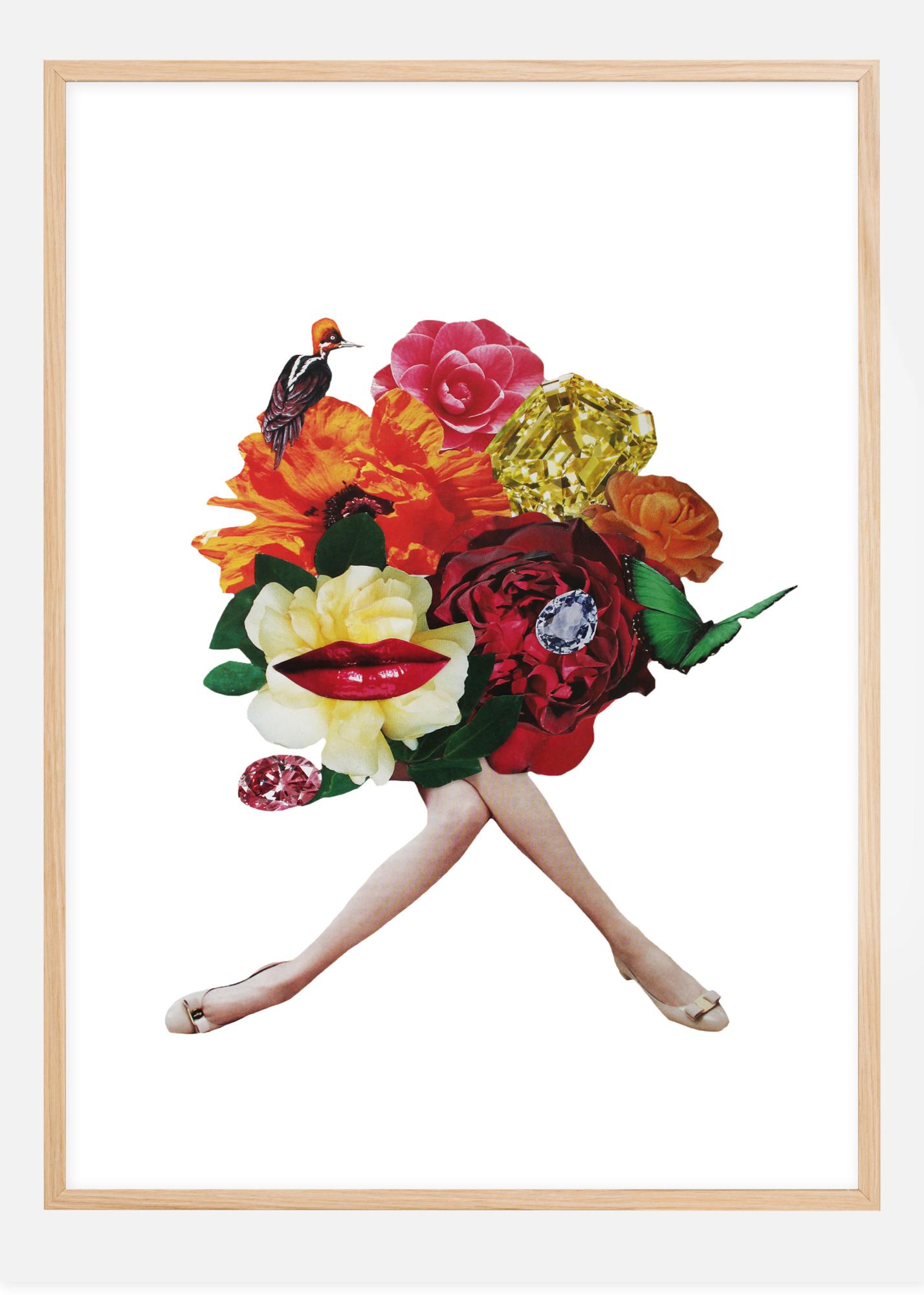A colourful picture of a woman hiding behind a beautiful composition of colourful flowers. A delightful green butterfly, three priceless jewels, perfectly proportioned lips and a magnificent Hoopoe are among the flowers. Set on a white background, this colourful and fun print will liven up any bare wall.