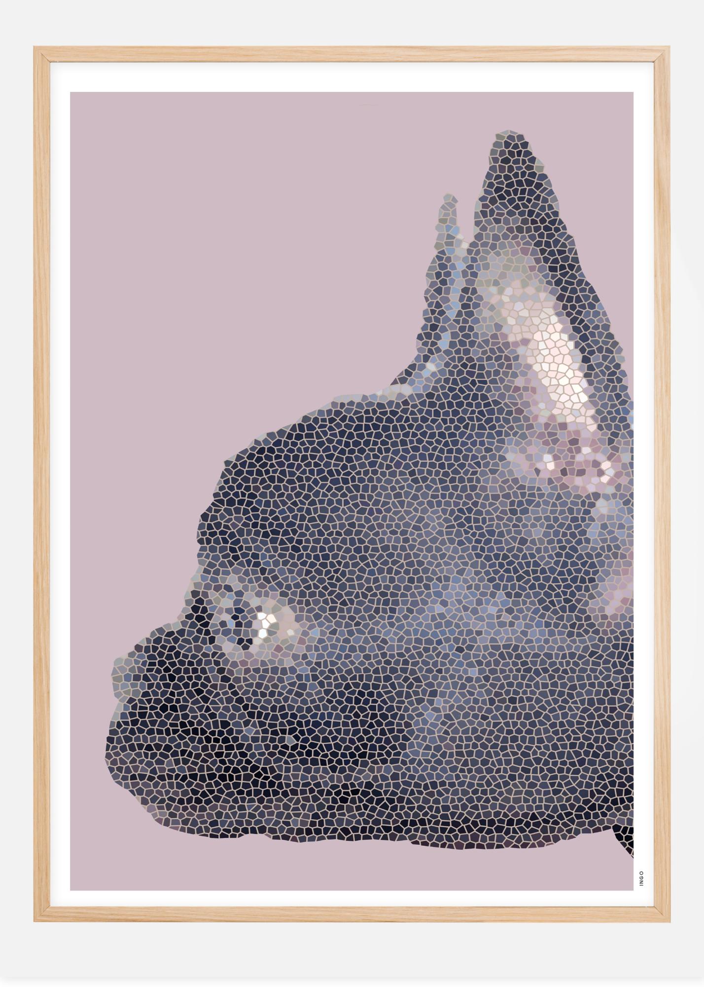 A black and white mosaic print of a carling dog. Set on a pink background, the natural light reflects on the dog's ear and eye. With its powerful jaw line, and pricked up ears, the dog stares to the left of the print as if he is looking at someone. A delighful picture for animal lovers.