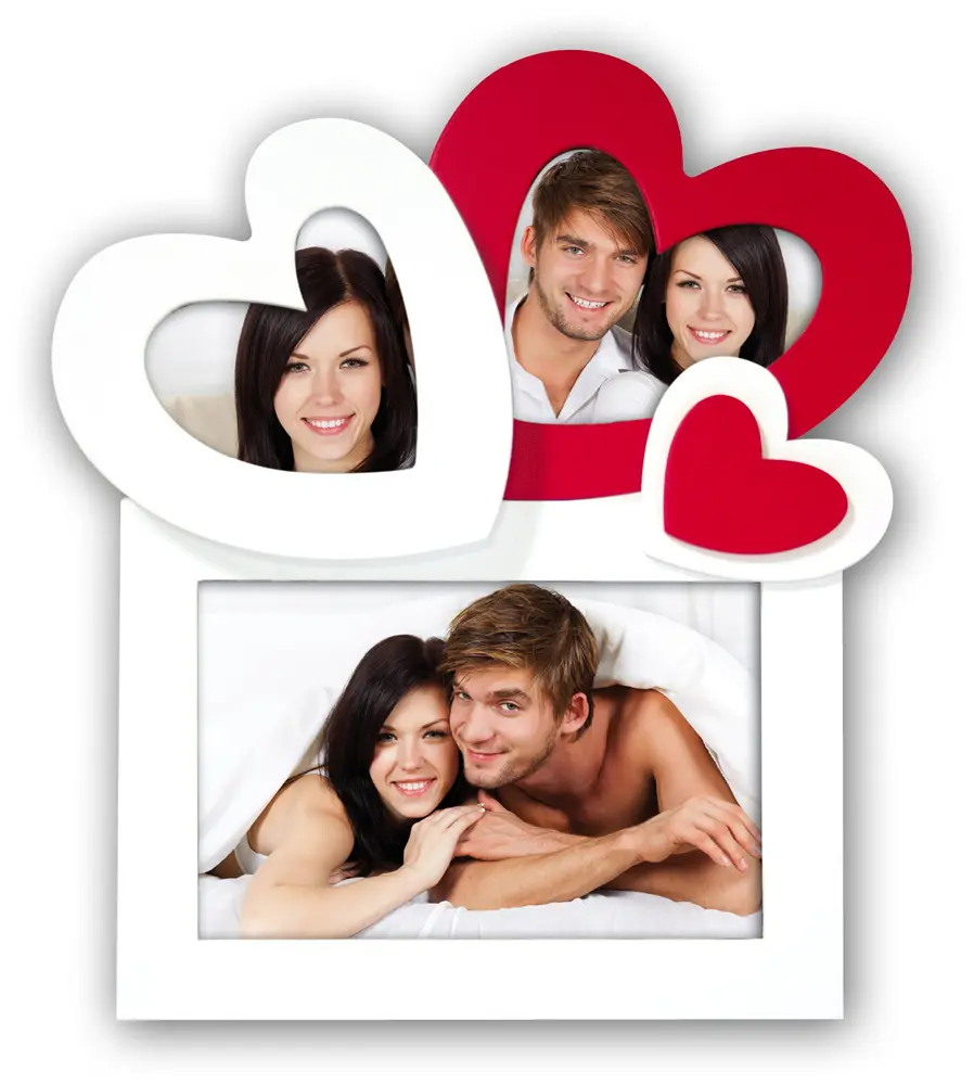 Ingrid is a white and red collage picture frame with two of the images heart-shaped. Fits just as nicely on the bookshelf as on the bedroom wall.