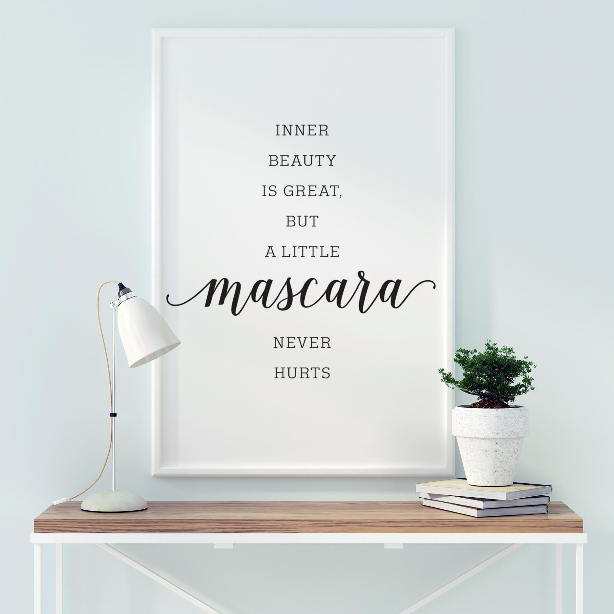 An effective motivational print conveying a message for everyone who loves to look great. Inner beauty is great, but a little mascara never hurts. A message to go by for that extra special look. A beautiful print to hang beside your dressing table.