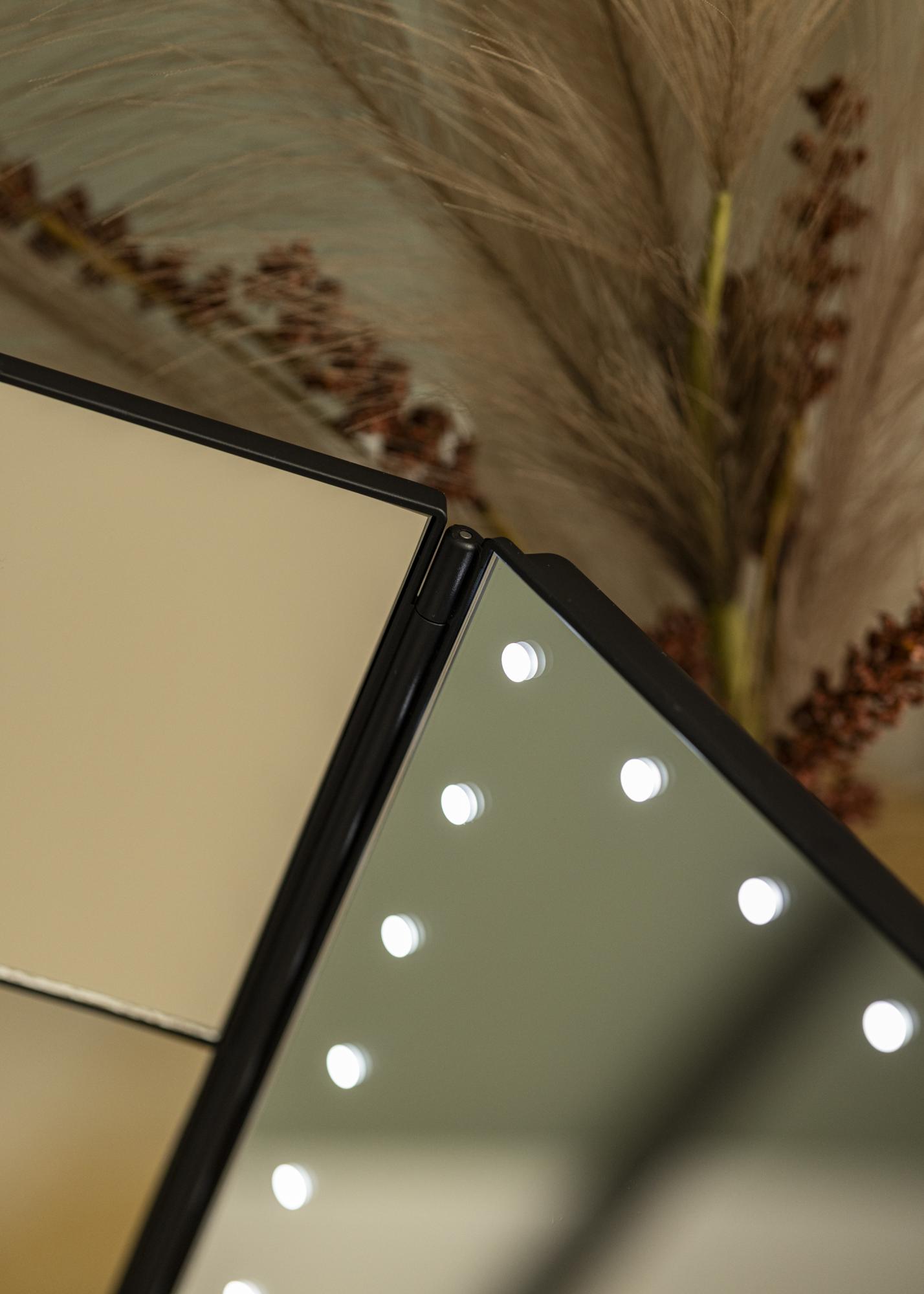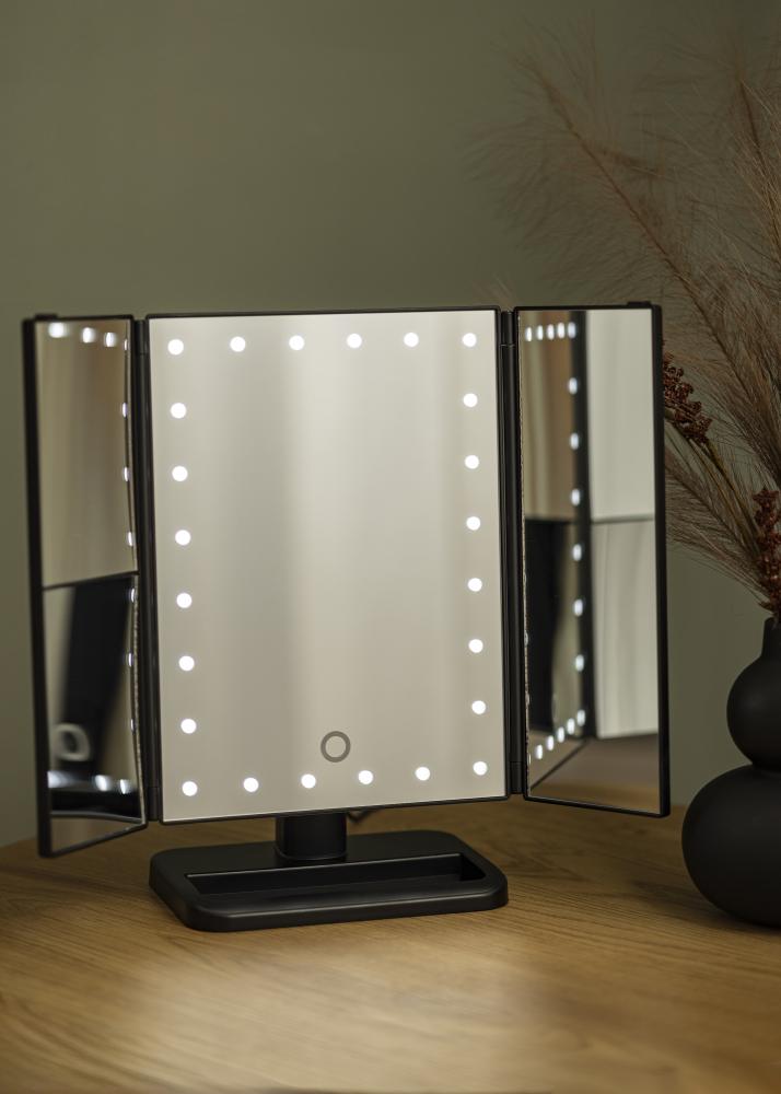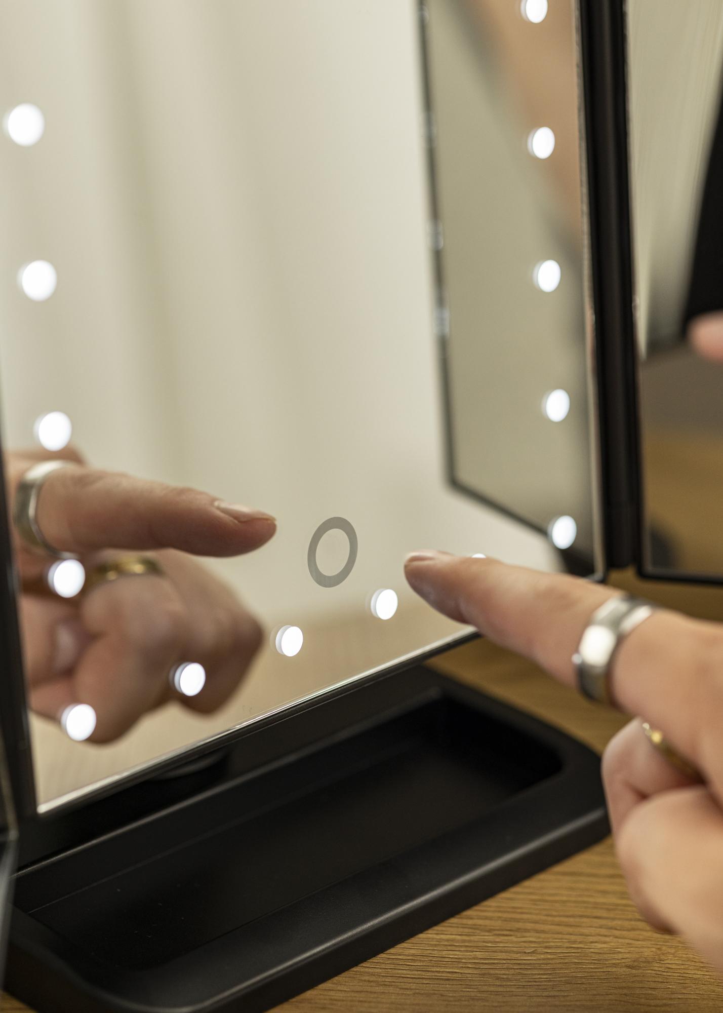 A fashionable, black 4-in-1 makeup mirror with Swedish design from KAILA. This makeup mirror, with its three sides, allows you to see your reflection from several different angles. It also has an adjustable stand, which allows the mirror to be rotated 180°. The mirror’s left side has magnifying mirror glass with x2 and x3 zoom. Around the large middle mirror run 24 decorative LED lights, which give a pleasant, warm white 3000K light. The integrated LED lighting can be lit by simply touching the button, and can easily be adjusted by holding the button for at least two seconds. This makeup mirror measures 38x25 cm and can be conveniently folded up when not in use.