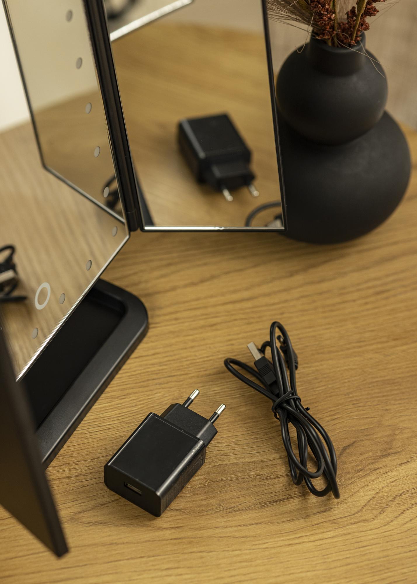The mirror is made from ABS to ensure the best possible quality, and LED lighting is a natural lighting that uses less energy. The mirror is powered by x4 AA batteries (not included), but can alternatively be charged with the included USB cable and plug.