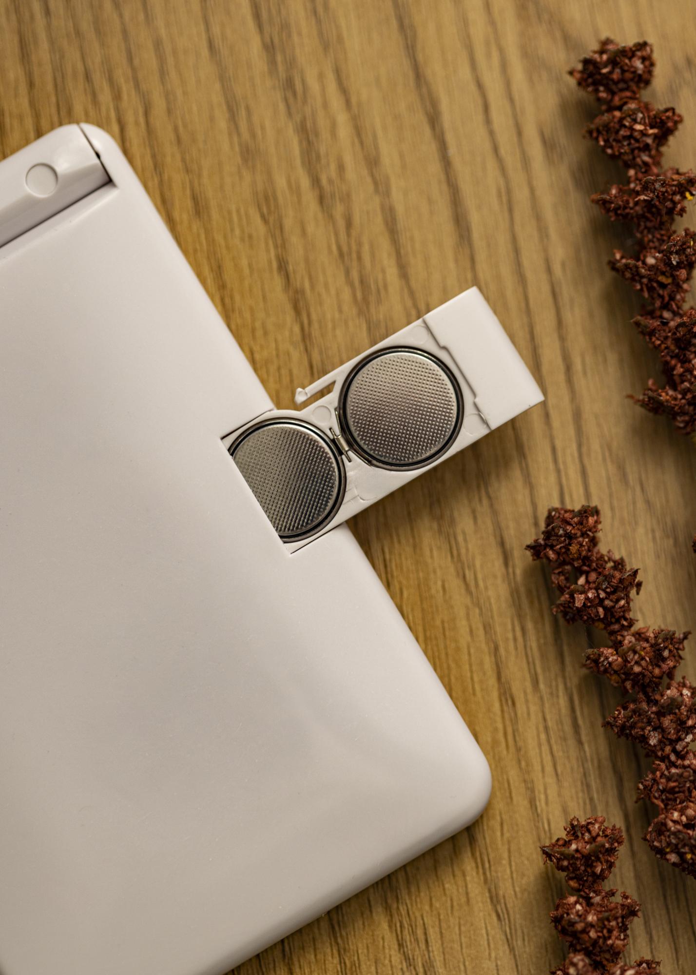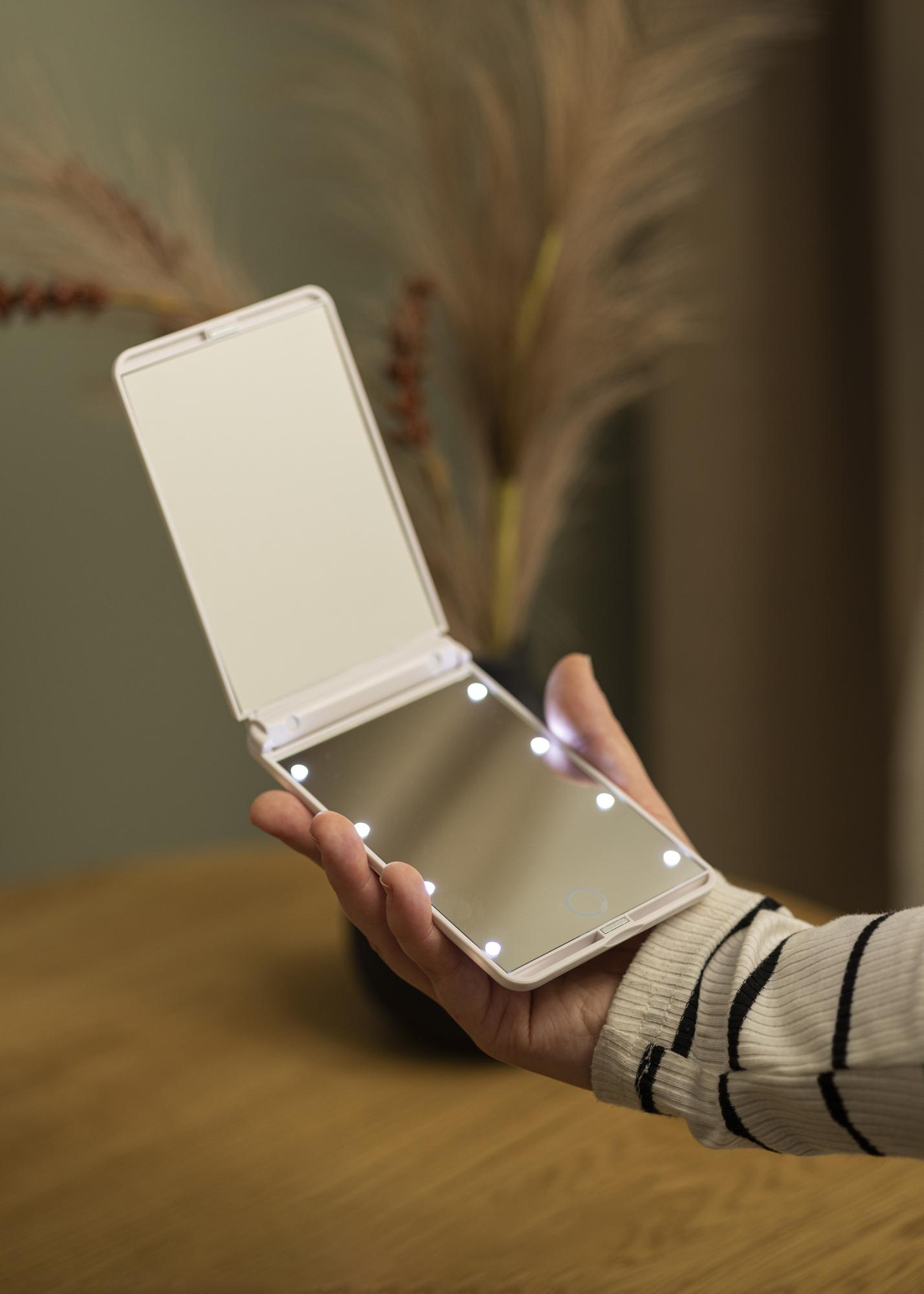 This collapsible makeup mirror with a white, elegant design makes it easy to see your reflection no matter where you are. It has integrated lighting around the crystal-clear mirror glass, with 8 strong LED lights. The upper mirror has magnifying mirror glass with a x2 zoom. The LED lighting is dimmable, and has a pleasant, warm white 3000K light that can easily be adjusted by pressing the touch button on the screen.