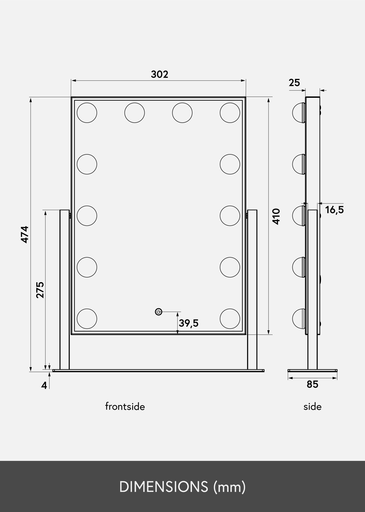 This is a makeup mirror with a luxury design and 12 design LED lightbulbs in an attractive shade of black. The lightbulbs make for a stylish frame around the generously sized mirror surface. The mirror measures 30x40 cm and the lighting gives a warm, white 3000K light. The lighting is activated by pushing the touch button on the screen, it has a dimmable function that can be adjusted by holding the button for a few seconds. You can, furthermore, change the vertical angle of the mirror, meaning that you can apply your makeup from the angle that works best for you. As well as these many functions, this elegant mirror is a decorative detail that will create a genuine Hollywood feel in your home!