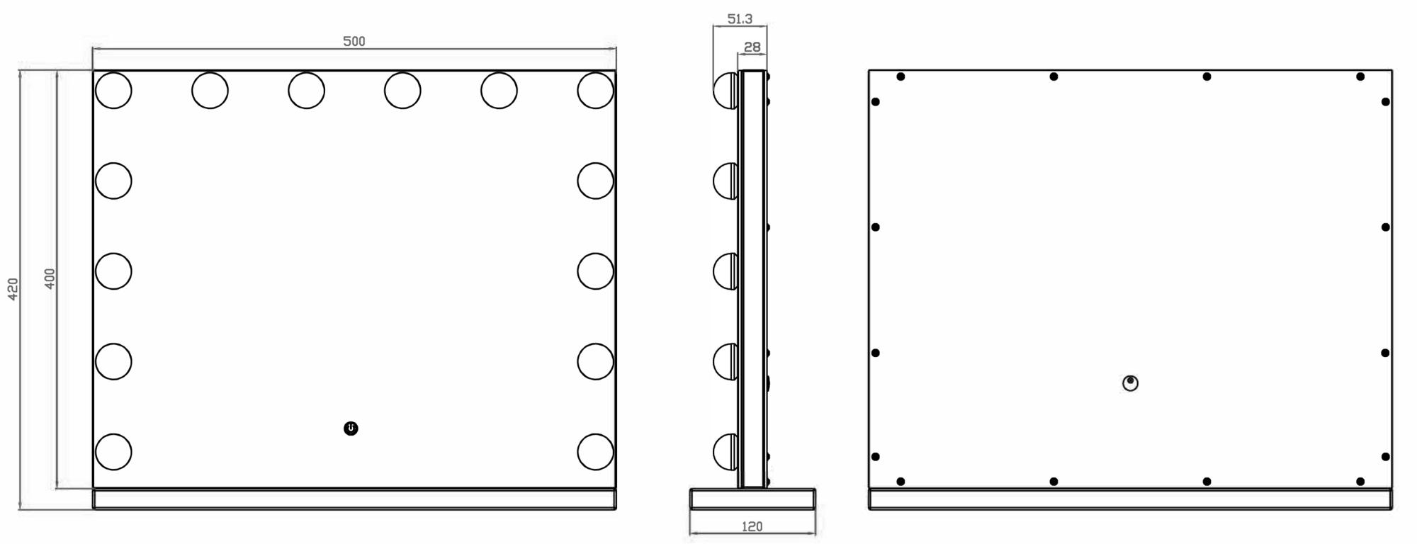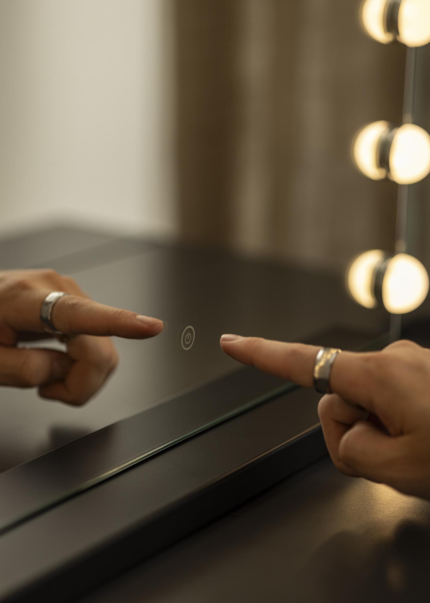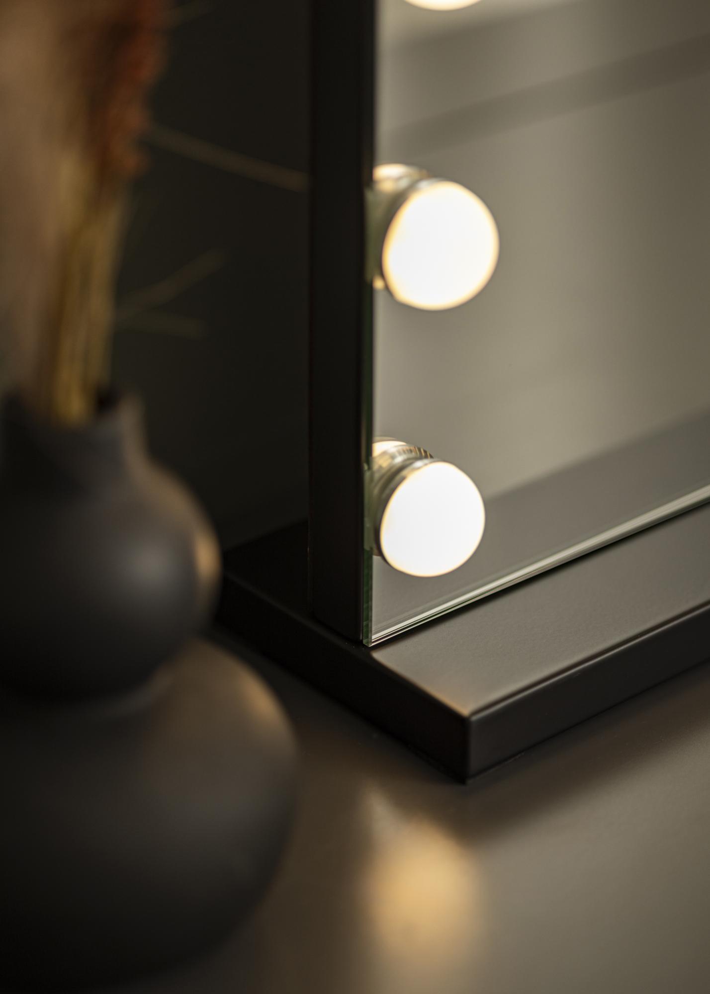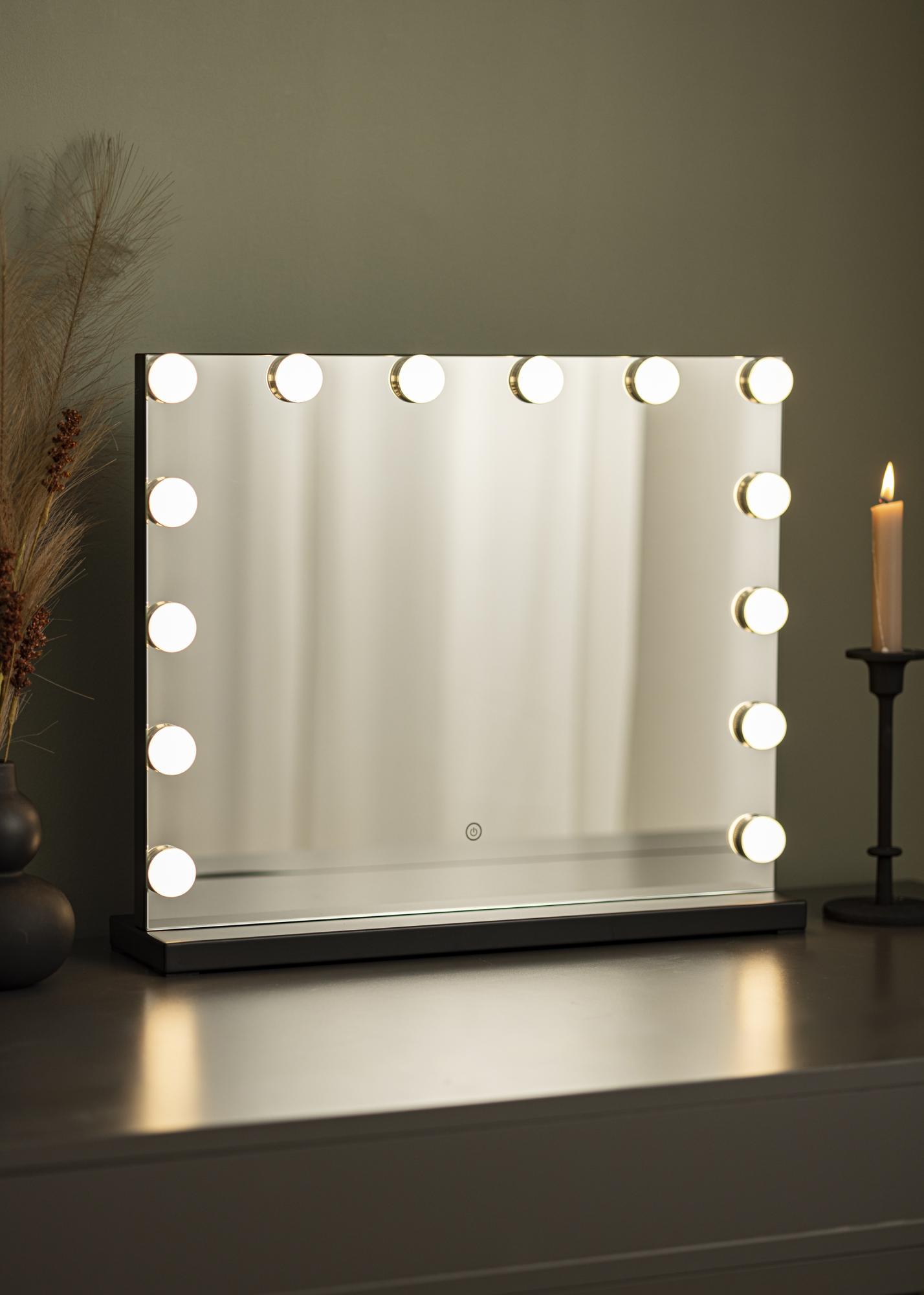 Transform your room into a makeup studio with this luxurious Hollywood-style makeup mirror from KAILA! This is a large makeup mirror with integrated lighting in the form of 14 LED lightbulbs which from an attractive frame around the large surface area. The LED lighting is dimmable and has a warm, white 3000K light. You can simply light up the mirror by touching the button on the screen, and then adjusting the strength by holding it for a few seconds. This mirror measures 50x45 cm.