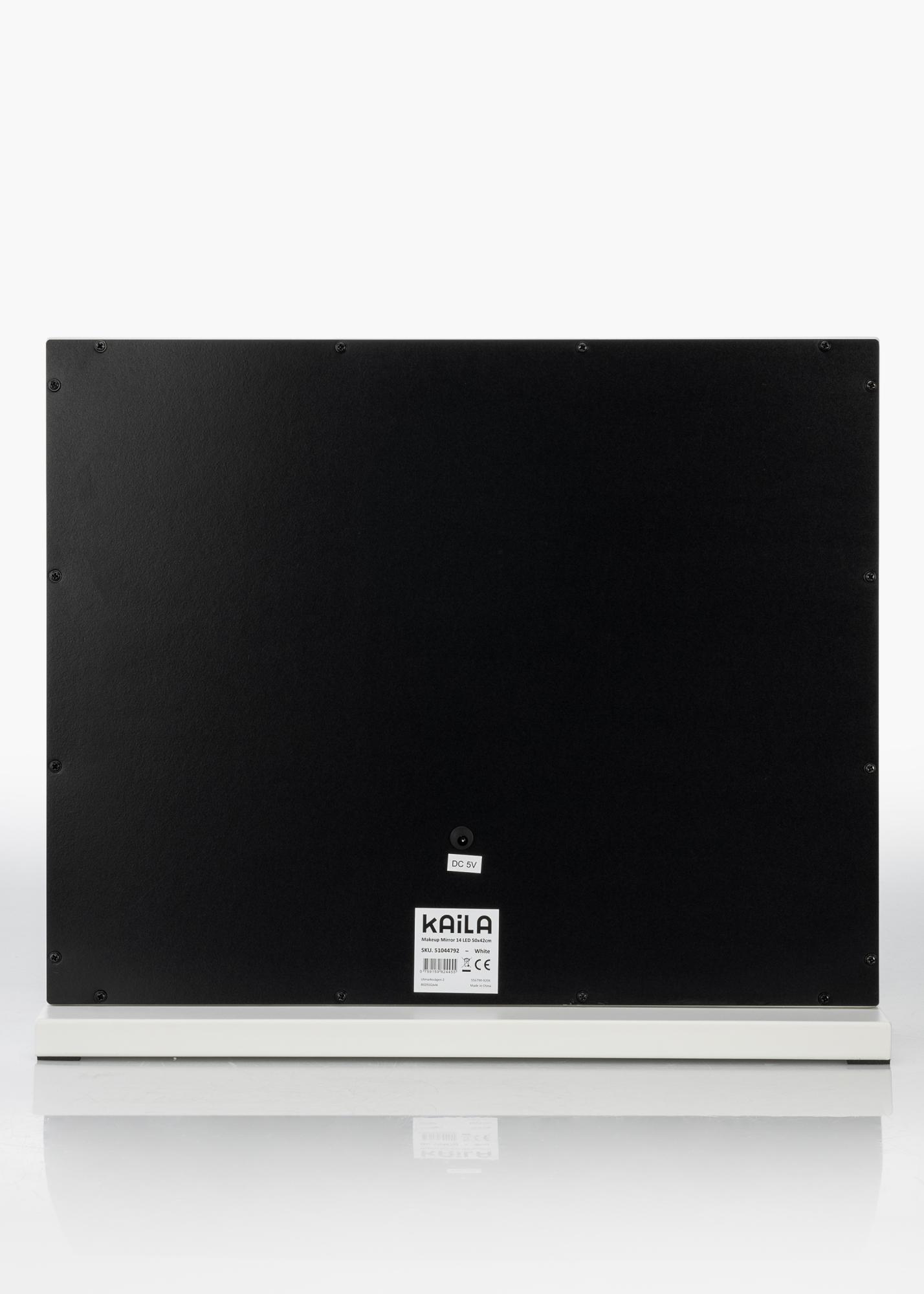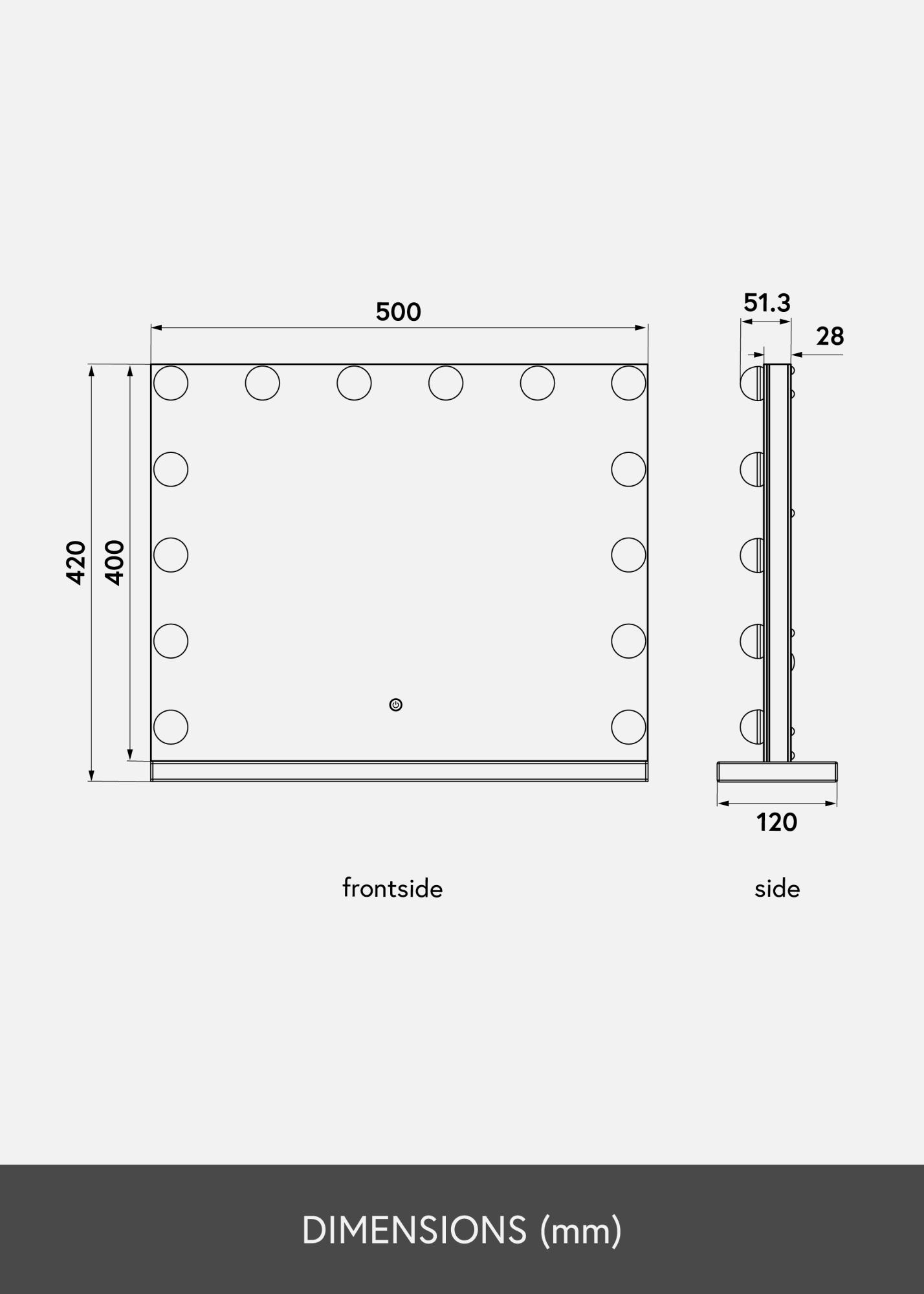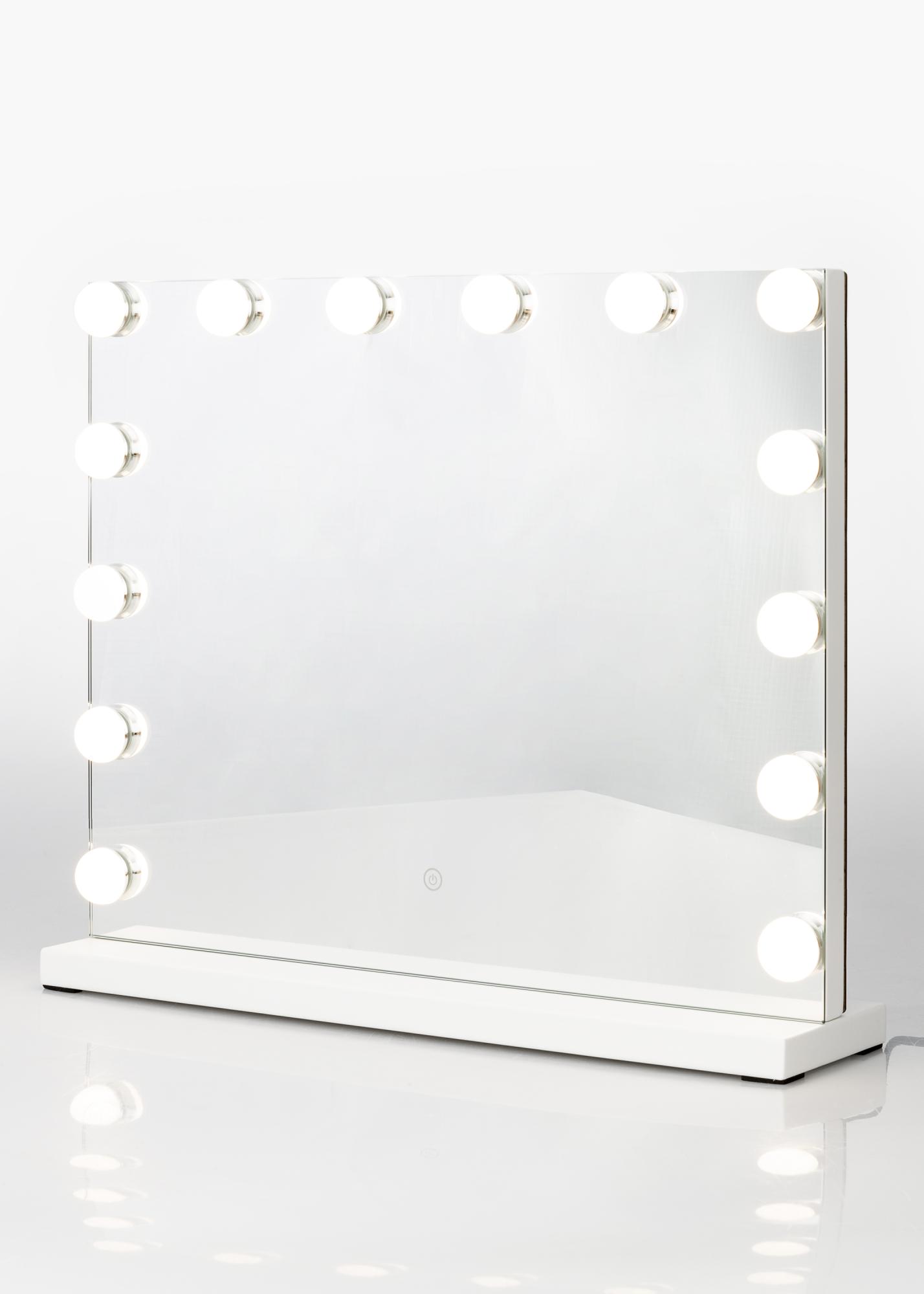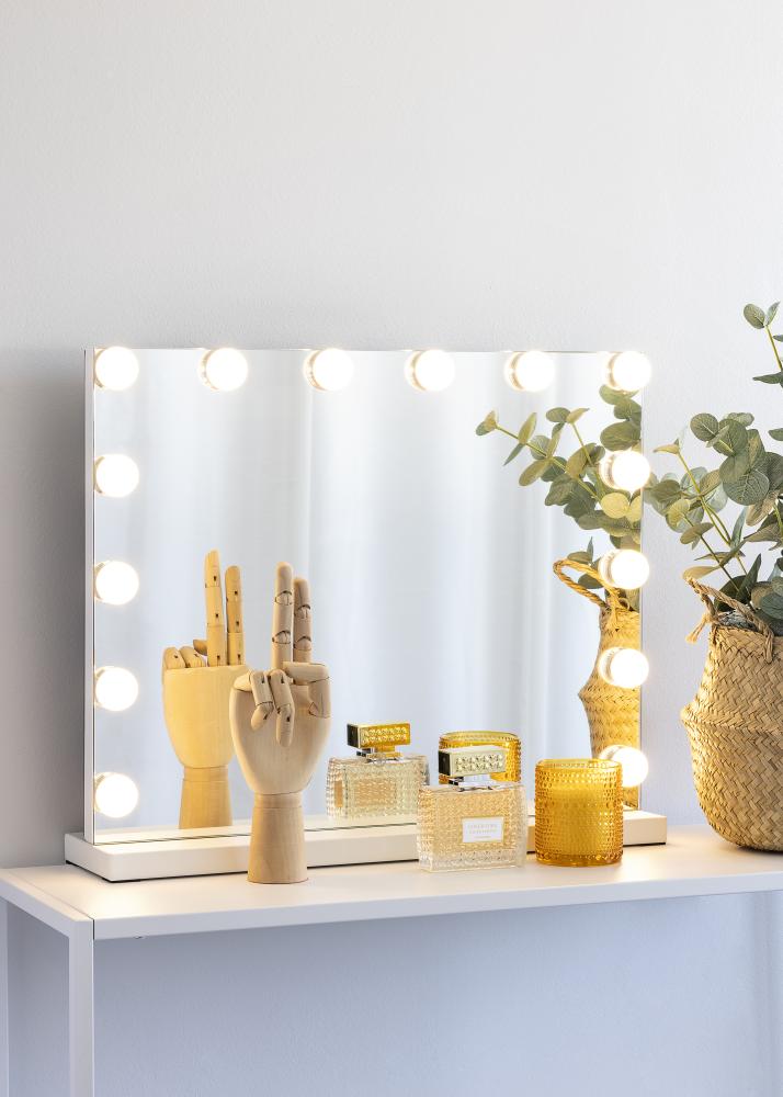 Transform your room into a makeup studio with this luxurious Hollywood-style makeup mirror from KAILA! This is a large makeup mirror with integrated lighting in the form of 14 LED lightbulbs which from an attractive frame around the large surface area. The LED lighting is dimmable and has a warm, white 3000K light. You can simply light up the mirror by touching the button on the screen, and then adjusting the strength by holding it for a few seconds. This mirror measures 50x45 cm.